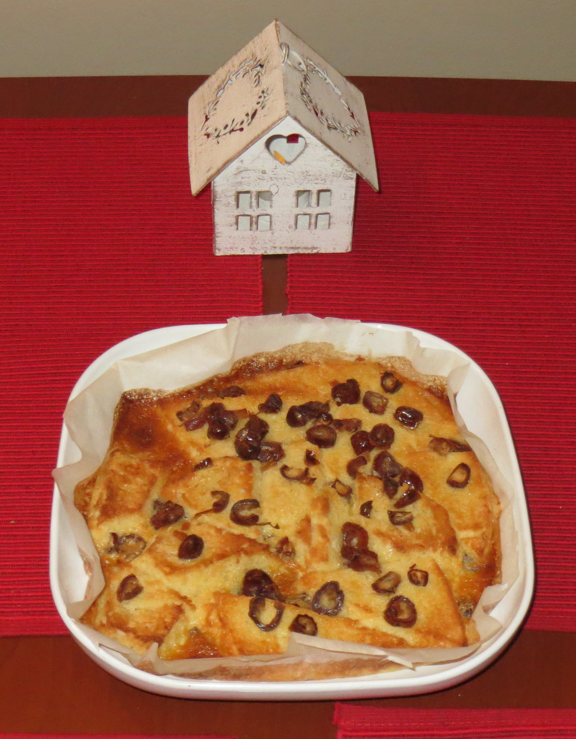 Lämmitä uuni 180 asteeseen. Voitele matala uunivuoka. Levitä voi panettoviipaleille, leikkaa ne vinosti puoliksi ja asettele limittäin vuokaan. Ota pehmenneet rusinat brandystä (säilytä brändy) ja ripottele ne panettoviipaleiden päälle.