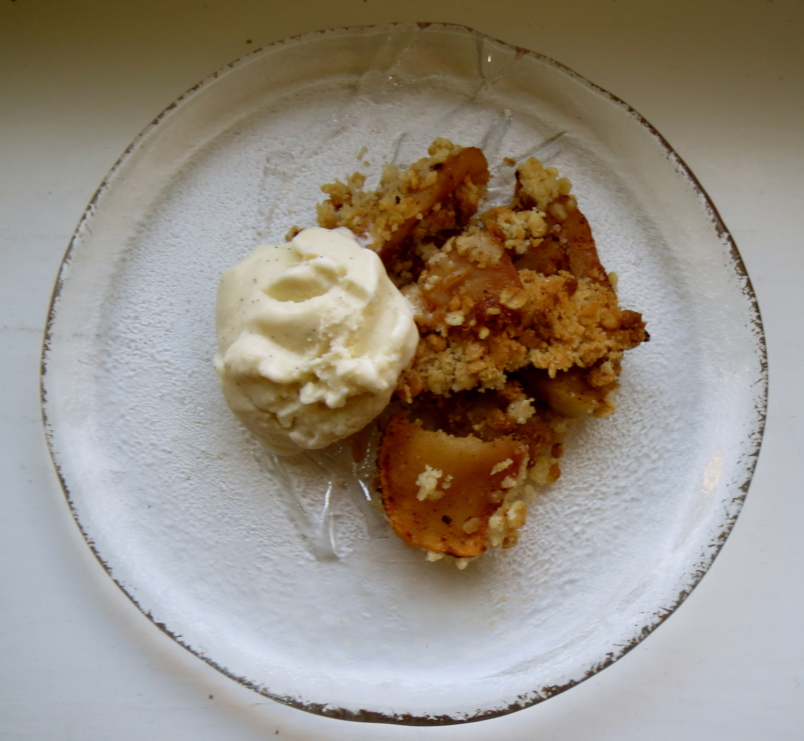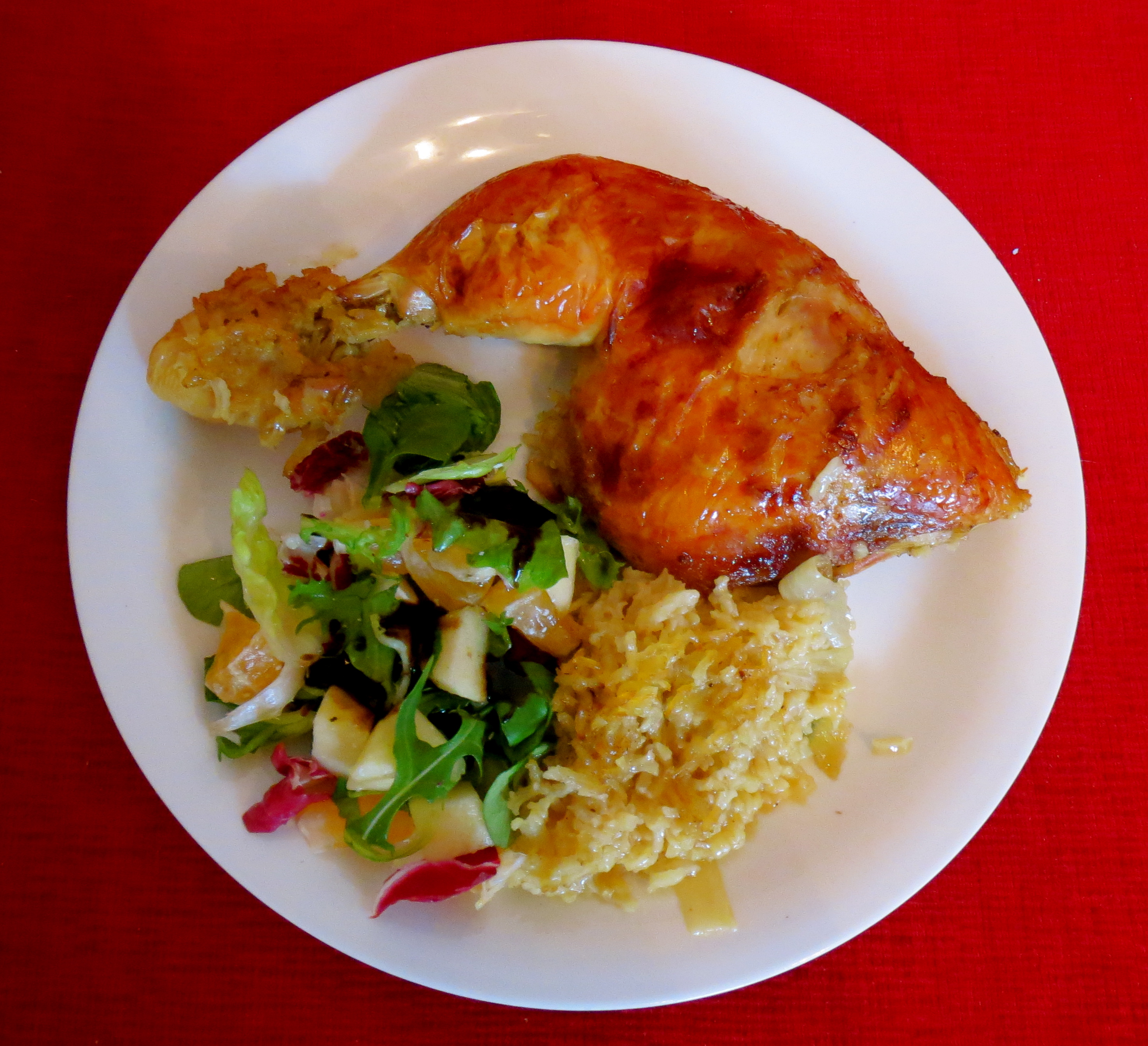Mitäpä siis valmistimme? Tällaisena kiireettömänä sisäilypäivänä voi vallan mainiosti odottaa ruoan valmistumista tunnin jos toisenkin, joten päädyimme haudutettavaan uunimurkinaan: pääruoaksi uunibroileria ja jälkiruoaksi uuniomenamurupaistosta. Reseptiikoista vastasi jälleen Verna Kaunisto-Feodorowin Reseptien aarteet ja lopputulos oli maukas. Ehkä en tätä broileria Vernan tapaan ihan näin suuresti ylistäisi; marinadista huolimatta ruoka jäi lopulta hieman laimean makuiseksi ja riisi olisi ehdottomasti kaivannut makuumme enemmän kasviksia, mutta pienellä parantelulla lopputulos olisi ollut erittäinkin hyvä. Paistos sen sijaan keräsi raadiltamme täydet pisteet. Omenaa ja murua juuri sopivassa suhteessa.
