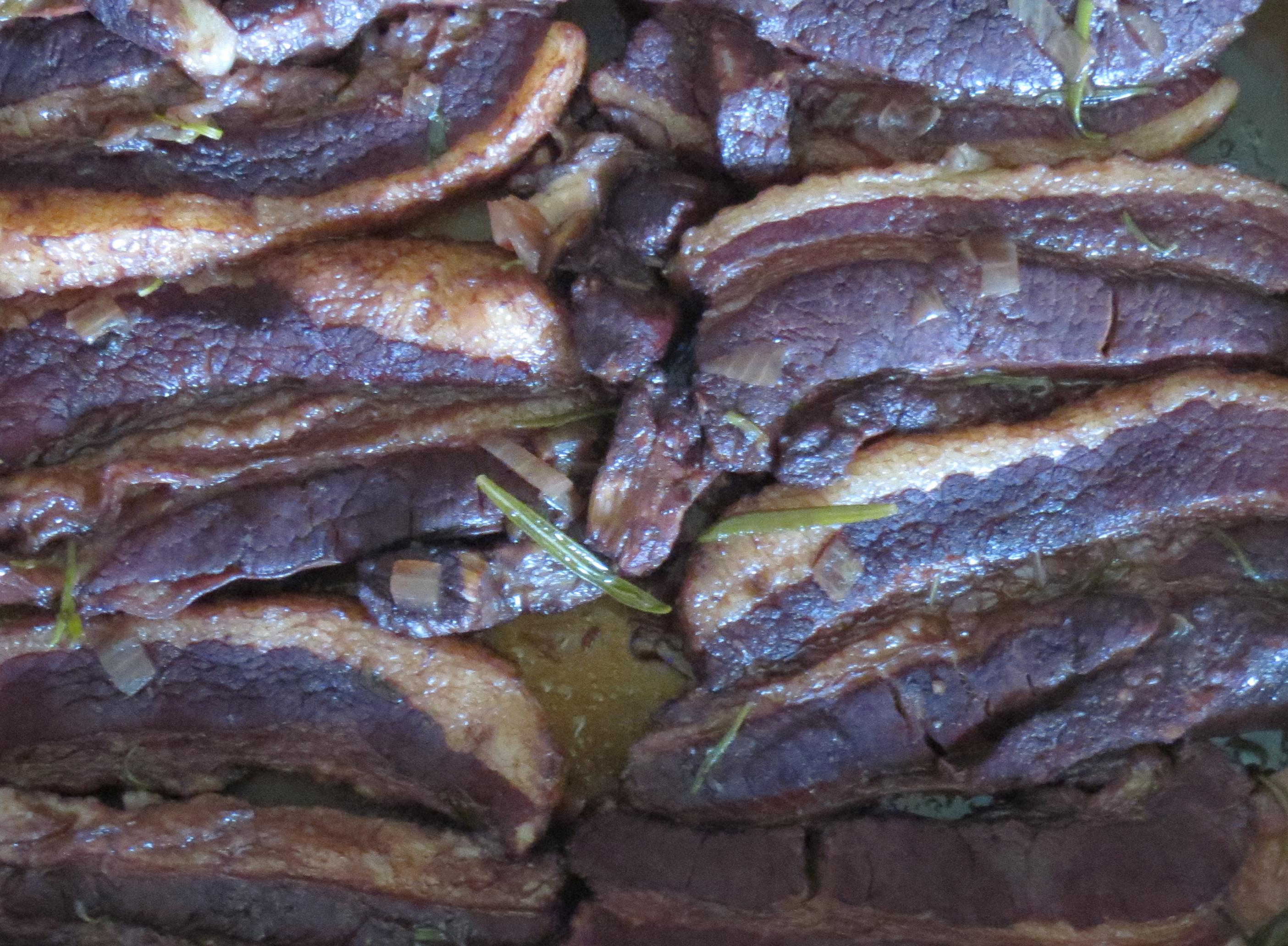 Laita tilavaan kattilaan sokerit ja paahda ne tummanruskeiksi. Lisää sokerin joukkoon sipulit ja savuluut ja karamellisoi niitä noin 2 minuuttia. Kaada joukkoon viini, mehu, lihaliemi, paahdettu valkosipuli ja yrtit. Kiehauta ja keitä, kunnes neste on haihtunut noin puoleen.