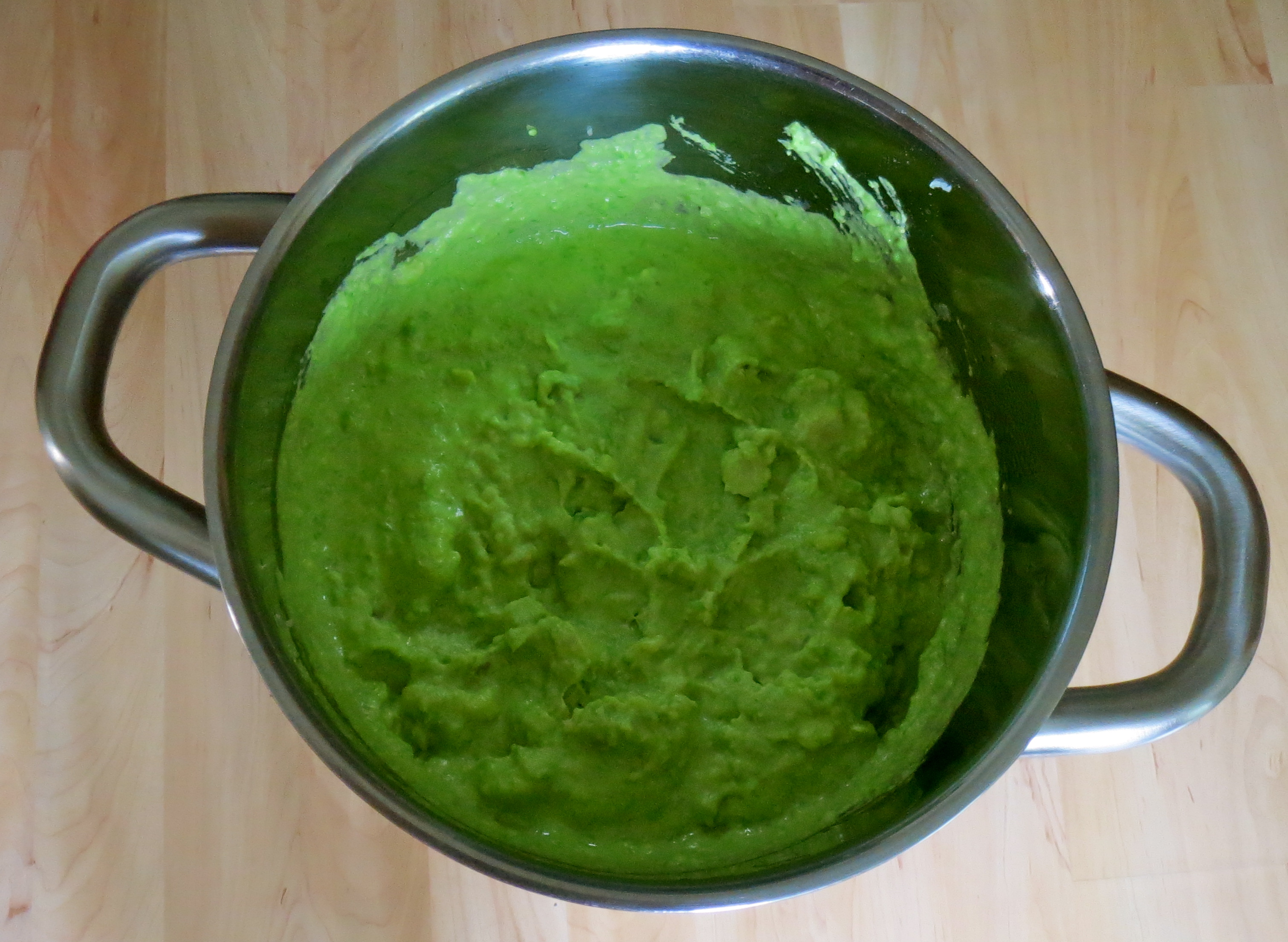 Sulata voi kattilassa, lisää loput ainekset perunoita lukuun ottamatta ja kiehauta, mutta älä keitä. Sekoita herneseos kulhossa sauvasekoittimella tai tehosekoittimessa tasaiseksi pyreeksi ja kääntele pyree perunasoseen joukkoon. Mausta tarvittaessa suolalla.