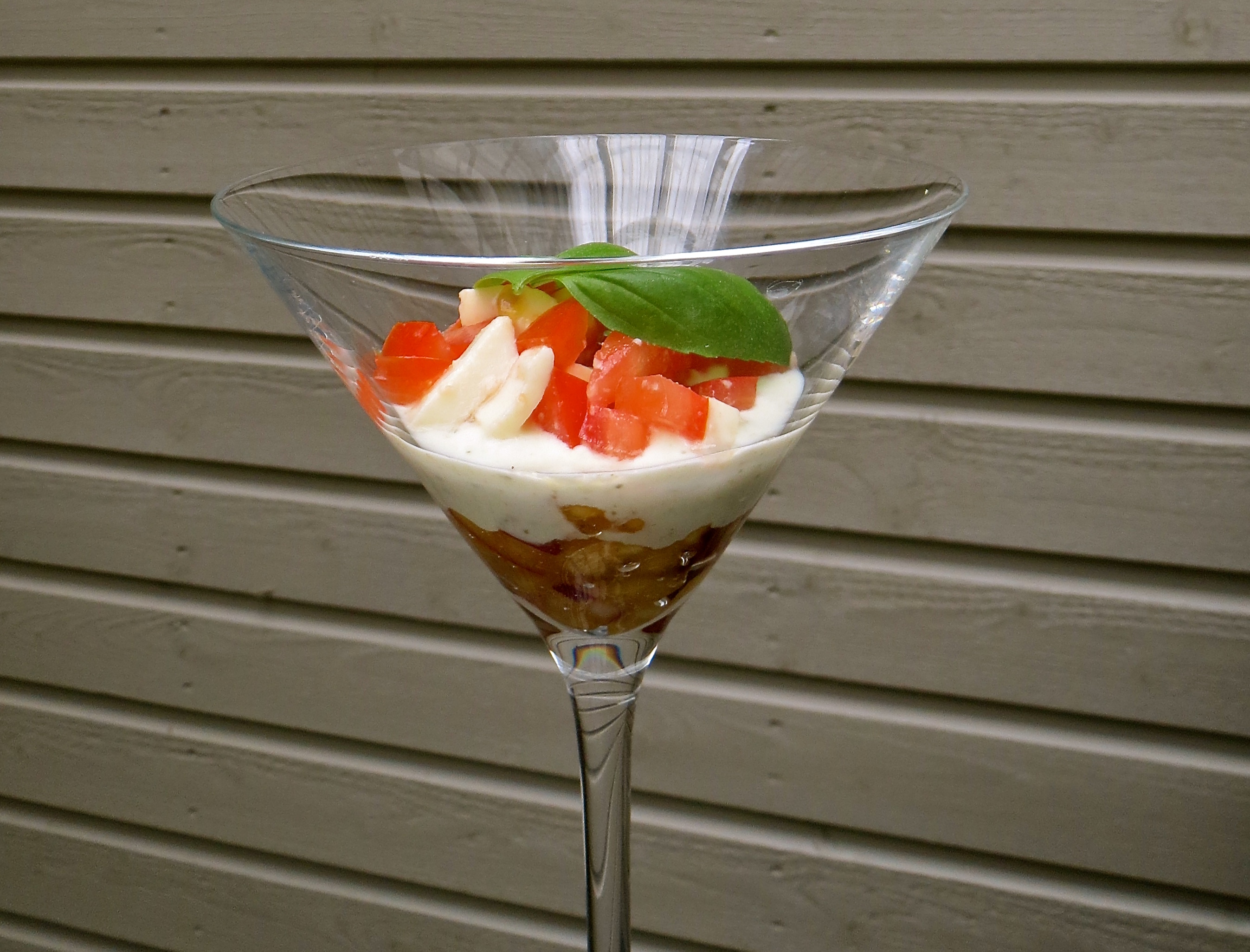 Laita laseihin ensin nektariinisalsaa, sitten turkkilaista jogurttia ja päällimmäiseksi tomaatti-mozzarella -seosta.