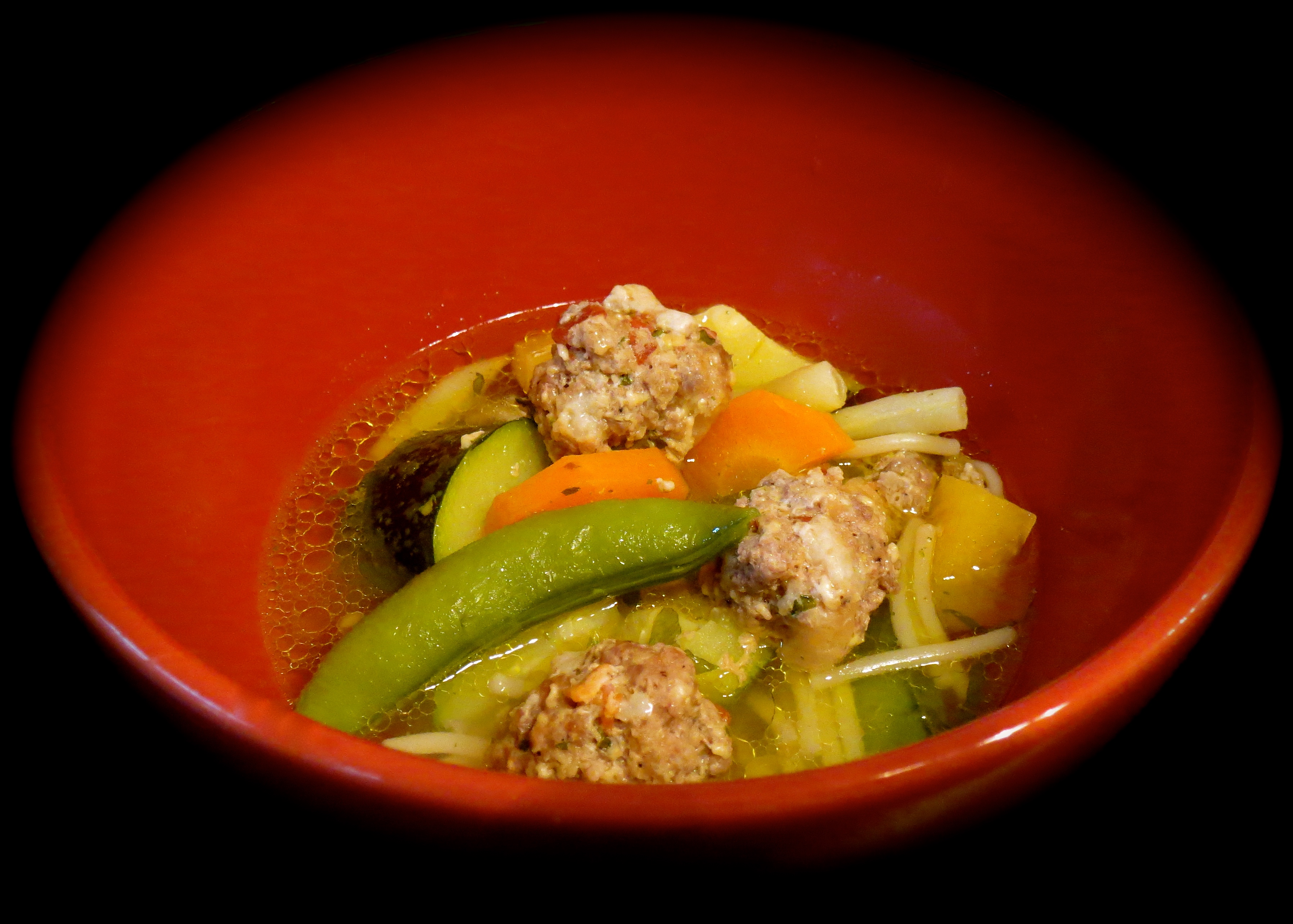 Kiehauta liemi kattilassa. Lisää lihapullat ja porkkana- sekä kesäkurpitsakuutiot. Anna kiehua keskilämmöllä noin 10 min.
