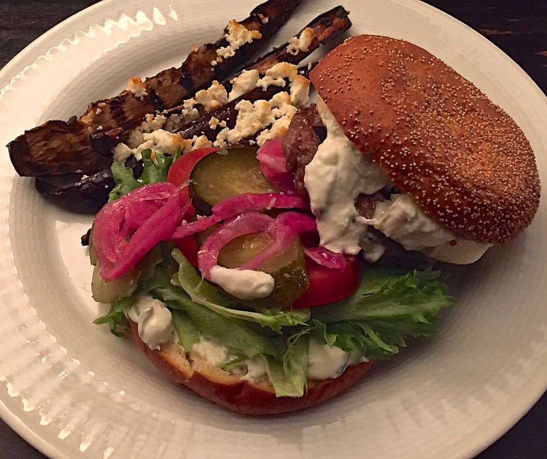 Aleksi sen sijaan pitää lammas-vuohenjuustoburgeriaan paahdetun munakoison ja fetan kera (20,90€) oivallisena valintana, jonka kruunaa tarjoilijan ammattitaitoisesti suosittelema maukas punaviini. Tästä siis pisteitä tarjoilijalle. Kuten myös varastosta metsästetystä alkoholittomasta valkoviinistä; onhan ensimmäinen vastaus kyselyyni, että kaikki alkoholittomat viinit ovat loppu. Mutta tässä kohtaa Macu ei suinkaan ole poikkeus: joko alkoholittomat ruokailijat ovat lisääntyneet tai ravintolat eivät vielä(kään) panosta tähän tarpeeksi; erityisesti tämän saran kuohuviini tuntuu hyvin usein olevan loppu – jos sitä sitten koskaan on hankittukaan…