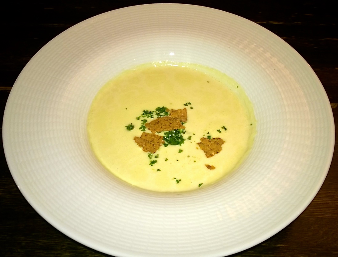 Entäpä sitten ruoka? Aloittelemme molemmat maa-artisokkakeitolla (9,70€), jonka pehmeä kermaisuus yhdistettynä pinnalla kelluviin näkkileivän palasiin on viehkeä makuelämys. Vaikka annos itsessään onkin täysin moitteeton, tuntuu joka tapauksessa oudolta, että jopa alkuruoaksi pienen keittoannoksen kumppanina ei tarjota ollenkaan leipää, jota odottaisi joka tapauksessa saatavan jo ennen virallisten tilausten saapumista. Miinusta siis leivättömyydestä, josta syystä annoksen pienikokoisuus saa sen vaikuttamaan jopa hieman ylihinnoitellulta.