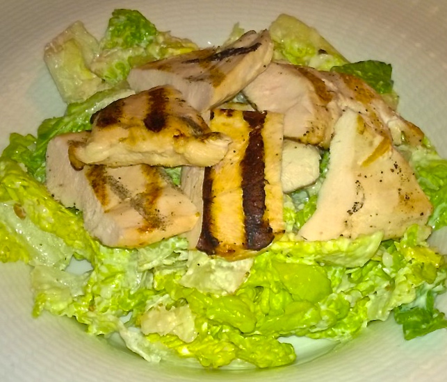 Pääruokien kohdalla teen itse pienoisen virhevalinnan päätyessäni grillatun broilerinrinnan kera tarjoiltuun caesarsalaattiin (16,60€). Annos on ihan hyvä, mutta täysin peruskaavasta poikkeamaton, monia runsaasti mieleenpainuvampia caesarsalaatteja olen ravintoloissa saanut purtavakseni. Ja leivässä säästellään taas; krutonkeja annoksesta löytyy vain jokunen pari. No, alkuperäinen suunnitelmani olikin tilata salaatti hiillostetulla lohella, mutta tarjoilijan kutsuttua annosta vaatimattomaksi, teen tämän pikaisen (virhe)vaihdoksen. Hmm.