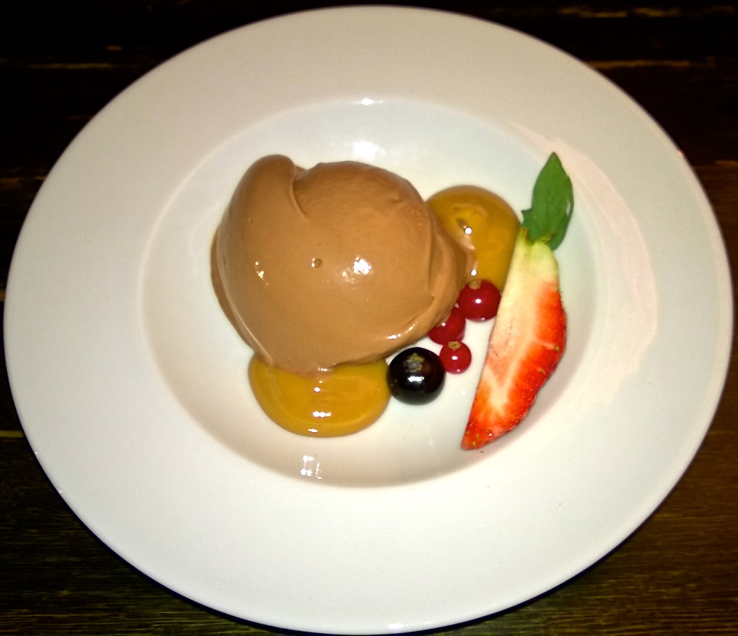 Kun siirrymme jälkiruokaosastolle, minä valitsen suklaajäätelöä kinuskikastikkeen kera (6,10€). Annos on maukas ja molemmat tuntuvat itse tehdyiltä. Ehkä hieman tyyristä pitkälti vain jäätelöpallosta, mutta menköön. Aleksin crème brûlée (9,50€) miellyttää sekin, mitä nyt hieman huvittaa, että listalla annos on nimetty ”crème brûlée ja marinoitua mangoa”, joka käytännössä tarkoittaa, että annoksen pinnalta löytyy muutama pienen pieni mangon palanen. Ehkäpä mangon mainostamista voisi miettiä hieman tarkemmin.