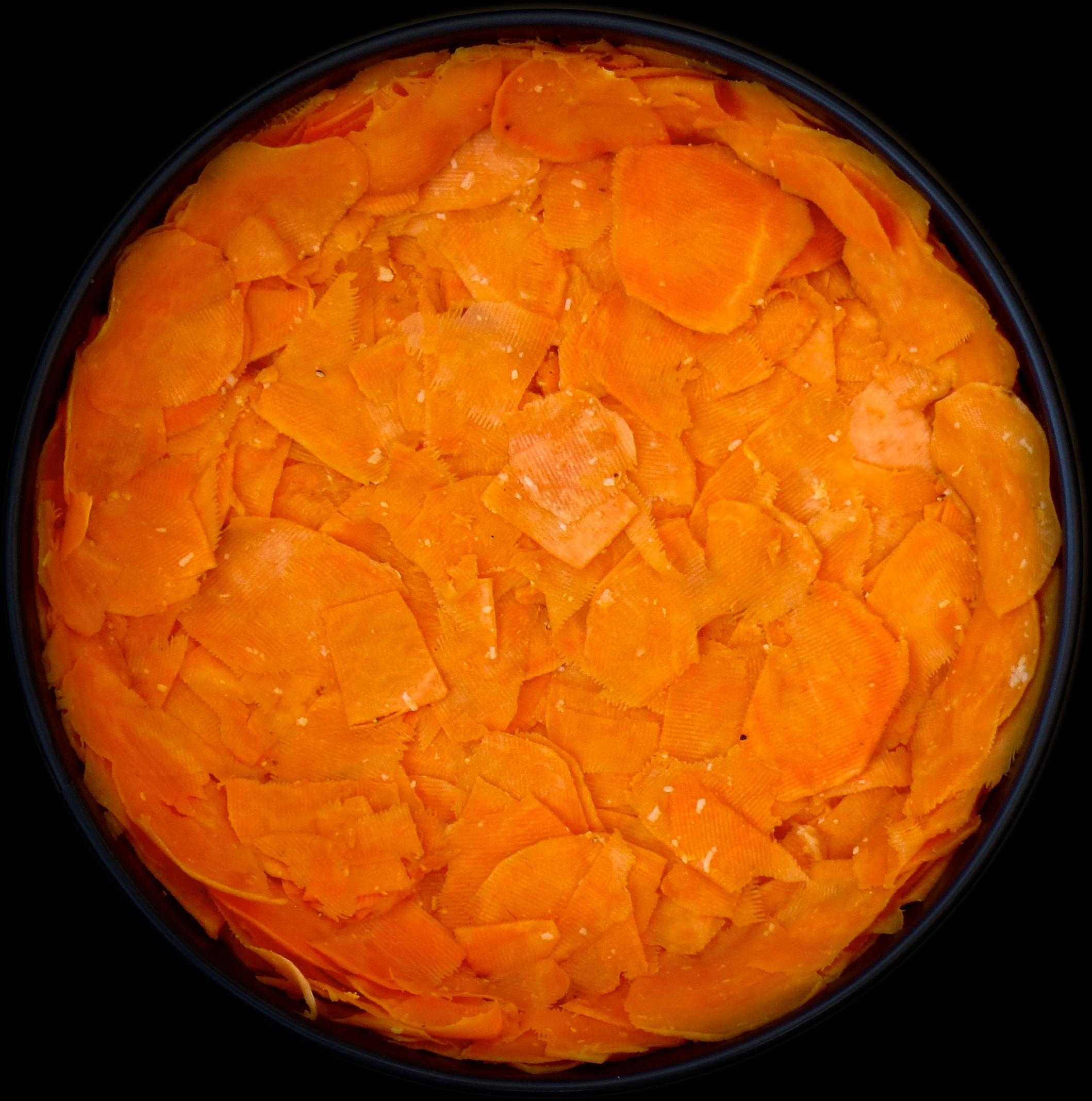 Lado bataattisiivut vuoan pohjalle ja nostele niitä vähän myös reunoille.