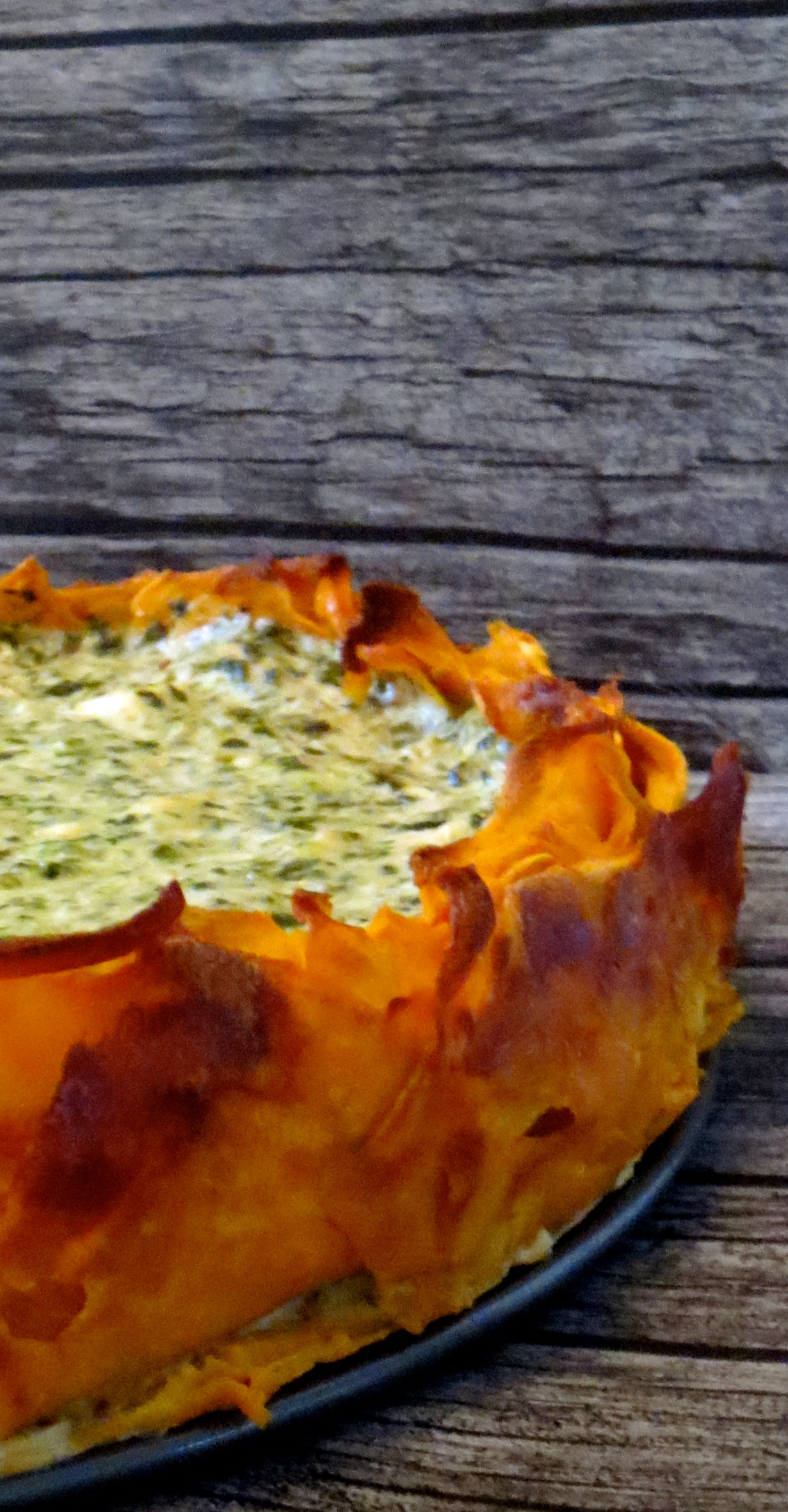 Hmm, tuolla prologilla pyrin kai esittelemään seuraavan tekeleeni, hauskan piirakkaidean, johon törmäsin Tinskun keittiössä -blogista itseni löydettyäni. Piirakan juttu on pohja, joka tehdään käytännössä pelkästä bataatista, viljat unohdetaan tällä kertaa kokonaan. Huippua; tätä ideaa hyödynnän aivan varmasti seuraavalla kerralla, kun kestittäväksi saapuu ruokavalioltaan gluteenitonta vieraskuntaa.