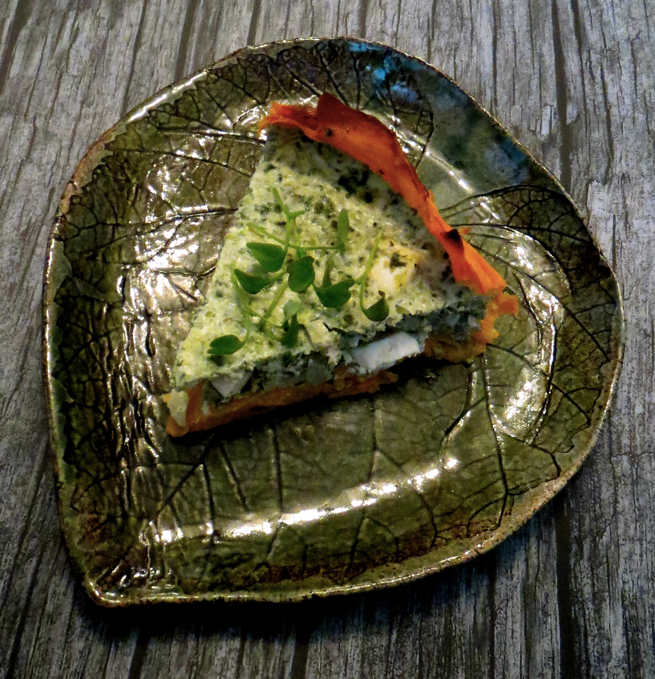 Feta-broileri-pinaattipiirakka bataattipohjalla