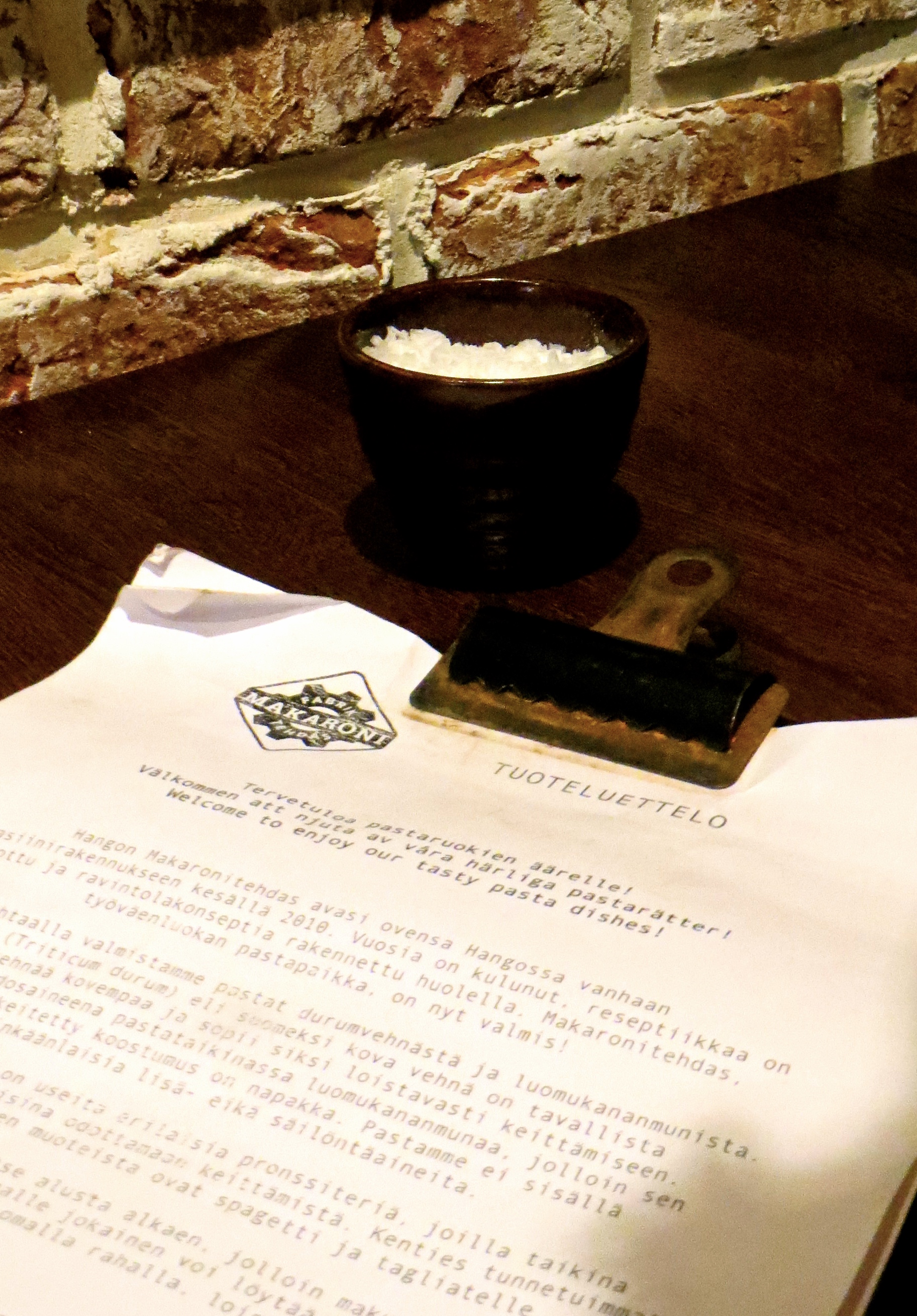 Kun saavumme Makaronitehtaalle maanantai-iltapäivänä neljän tienoilla, kohtaamme tyhjähkön ravintolasalin, vaikka lisäksemme paikalle onkin jo löytänyt jokunen seurue. Asiakaskunta kuitenkin karttuu hetki hetkeltä ja poistuessamme ravintola on jo miltei täynnä. No, aiemmin yksin Hangon Makaronitehtaana tunnettu yritys on jo jonkin aikaa keräillyt mainetta ja kunniaa kyseisessä kaupungissa kesäravintolana.
