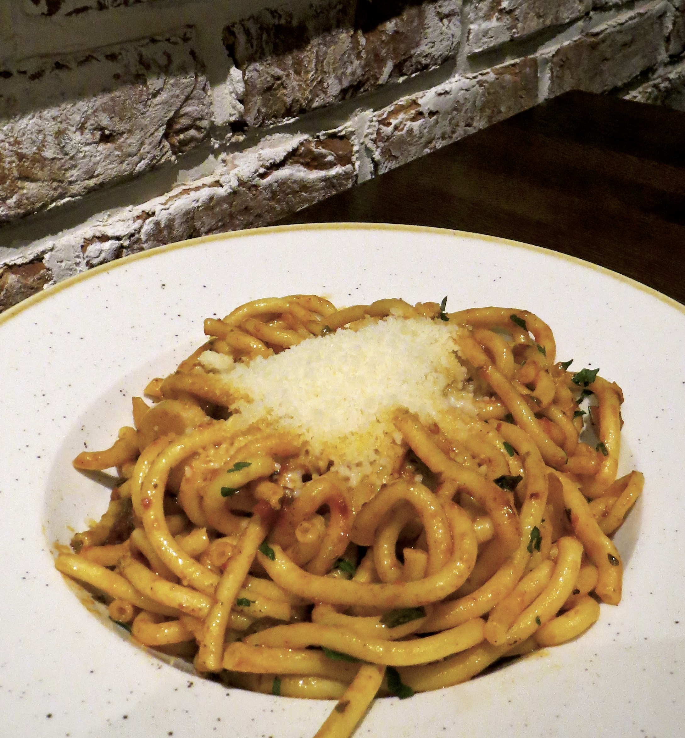 Aleksi päätyy makkarapastaan (17,20€), jossa Makaronitehtaan omalla reseptillä valmistettu fenkolilla maustettu maalaismakkara saa seurakseen tomaattia, chiliä, valkosipulia, persiljaa, basilikaa ja parmesaania. Aleksi pitää sopivasti potkivasta lautasellisestaan erittäin paljon ja myös henkilökohtaisesti voin todeta makkaran sekä annoksen ylipäätään makoisaksi.