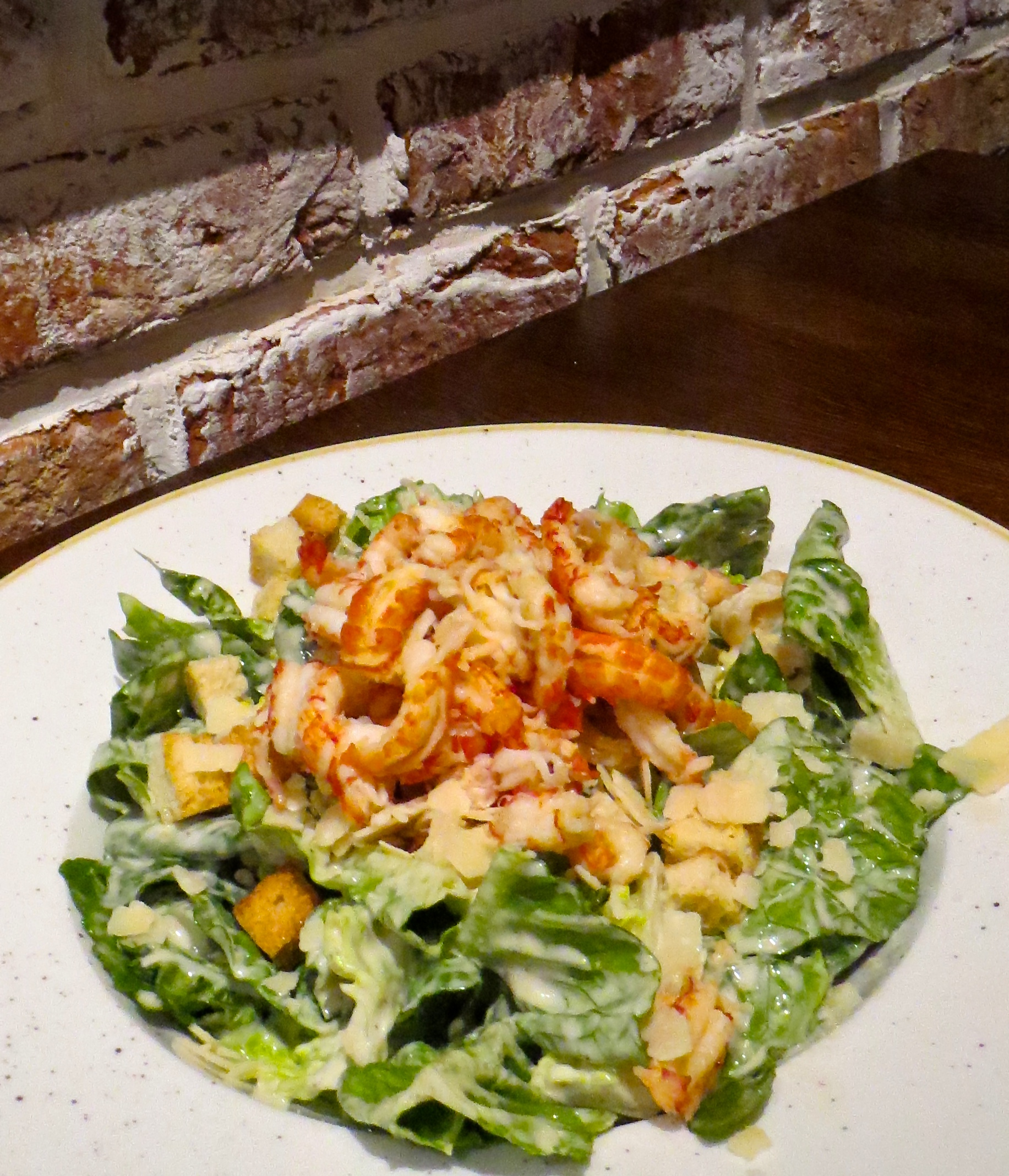 Mutta puhutaanpa vihdoin ruoasta. Kun kerran makaronitehtaalla ollaan, syödään tietysti… salaattia. Joku – kuten vastapäätä istuva aviomieheni – saattaisi pitää outona haluta juuri makaroniravintolaan ja tilata sitten jotakin aivan muuta, mutta minkäs sitä mielihaluilleen mahtaa. Ruokalistalta esiin ponkaiseva caesar-salaatti jokiravuilla (14,00€) houkuttelee niin kovasti, että päätän jättää makaronit seuraavaan – jonka arvaan jo etukäteen olevan tulossa – kertaan. Ja hyvä näin, salaatti on jättihyvä ja jo yksin sitä kruunaavan mahtavan rapupinon nähtyäni tiedän tehneeni oikean valinnan. Tästä täydet pisteet.