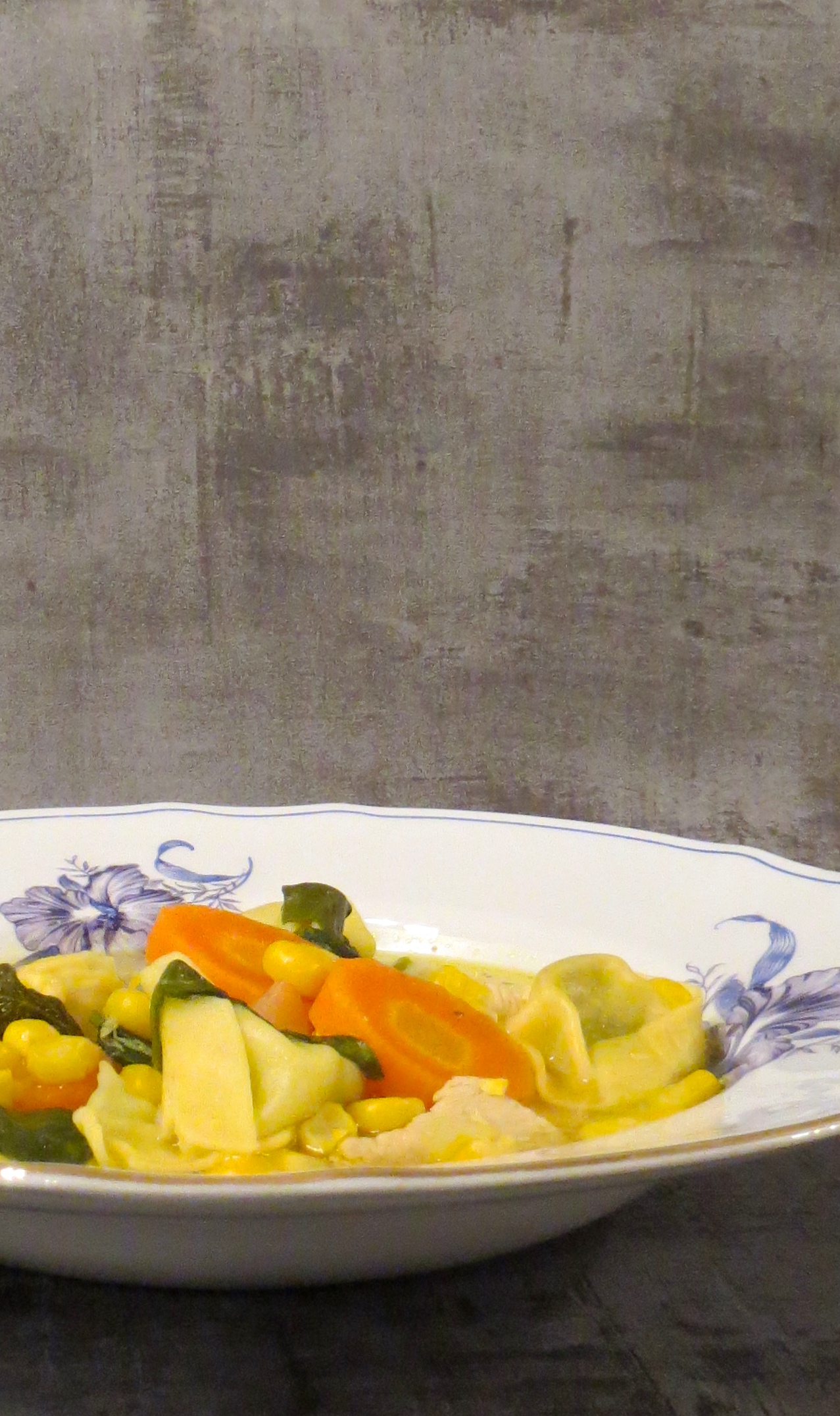 Lisää porkkanat sekä sipuli. Anna kiehua noin 5 min. ja lisää maissit, tortellinit ja pinaatti. Lisää tarvittaessa lientä. Anna kiehua muutama minuutti ja tarjoa.