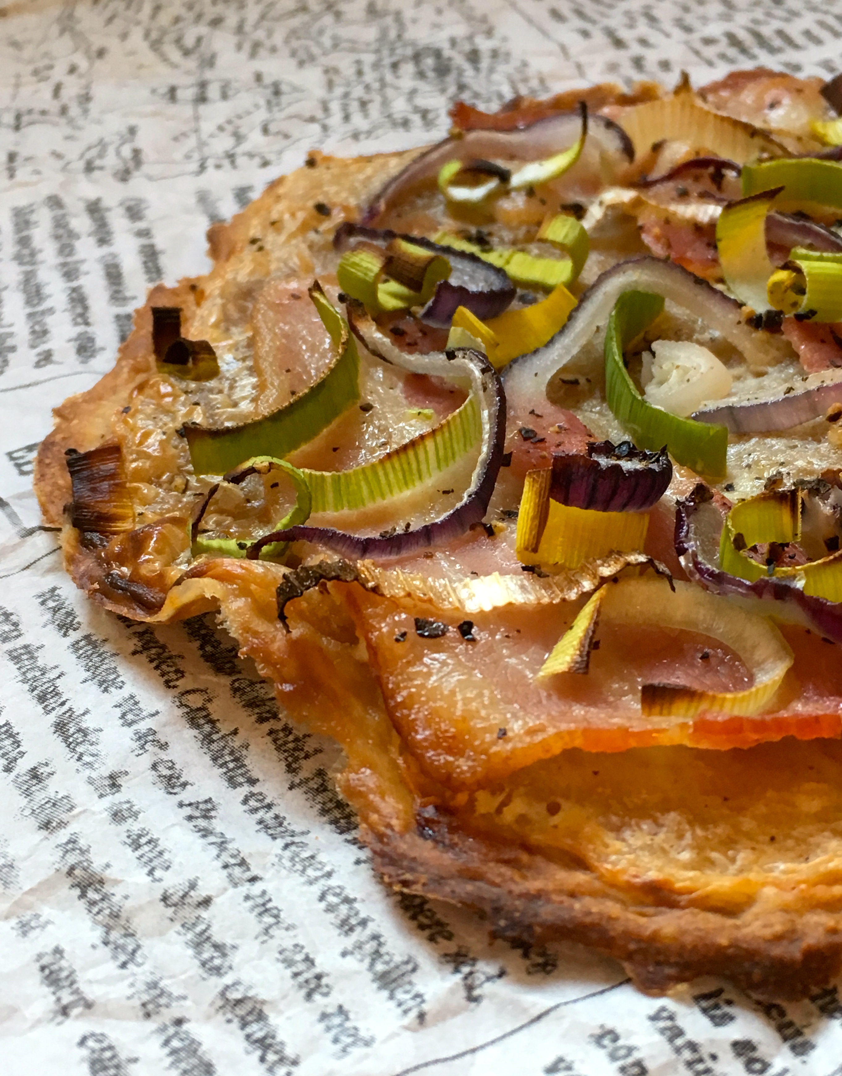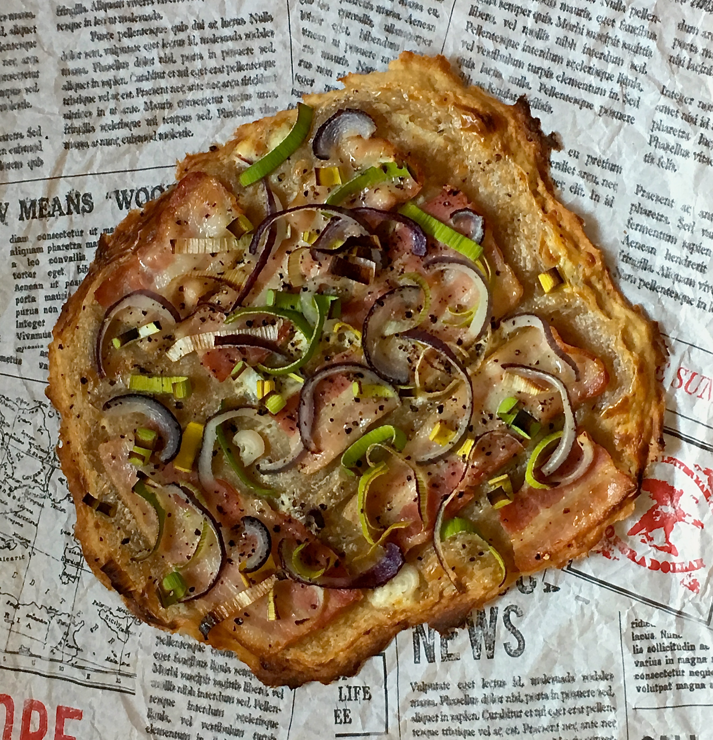 Leivinuunia meillä ei valitettavasti ole, mutta hyviä liekkipiiraita saa aikaiseksi sähköuunillakin. Ranskankermamatolle pekonia, punasipulia sekä purjoa ja se on pitkälti siinä, saksalainen lohturuoka, kuten jostakin luin näitä kutsuttavan. Reseptiksi valikoin Turun Sanomien tarjoaman. Ainakin nämä kolme asiaa on Flammkuchenien kohdalla syytä muistaa: hiivaton taikina, pekoni raakana piiraan päälle, tulikuuma uuni ja etukäteen kuumennettu pelti.