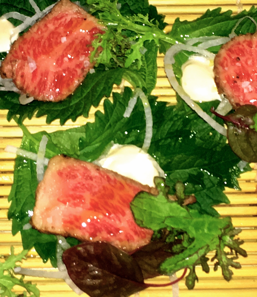 Mutta ruokaan. Koska ravintola tarjoilee maailmankuulua japanilaista Wagyu-lihaa, emme malta pitää tuosta näppejämme erossa ja tilaamme sitä alkupalaksi. Pakko tietää miltä maistuu oluella juotettu, hierottu, klassista musiikkia kuunnellut ja muutenkin kaikin tavoin stressitöntä elämää viettänyt härkä. Hyvältähän tuo maistuu, mutta hintakin on toki suolainen, 22,60€ muutamasta pienestä palasesta. Kun tämä huuhdellaan alas cava-lasillisilla (à 11,00€) voidaan puhua jo melko tyyristä paikasta. No, näillä mennään.