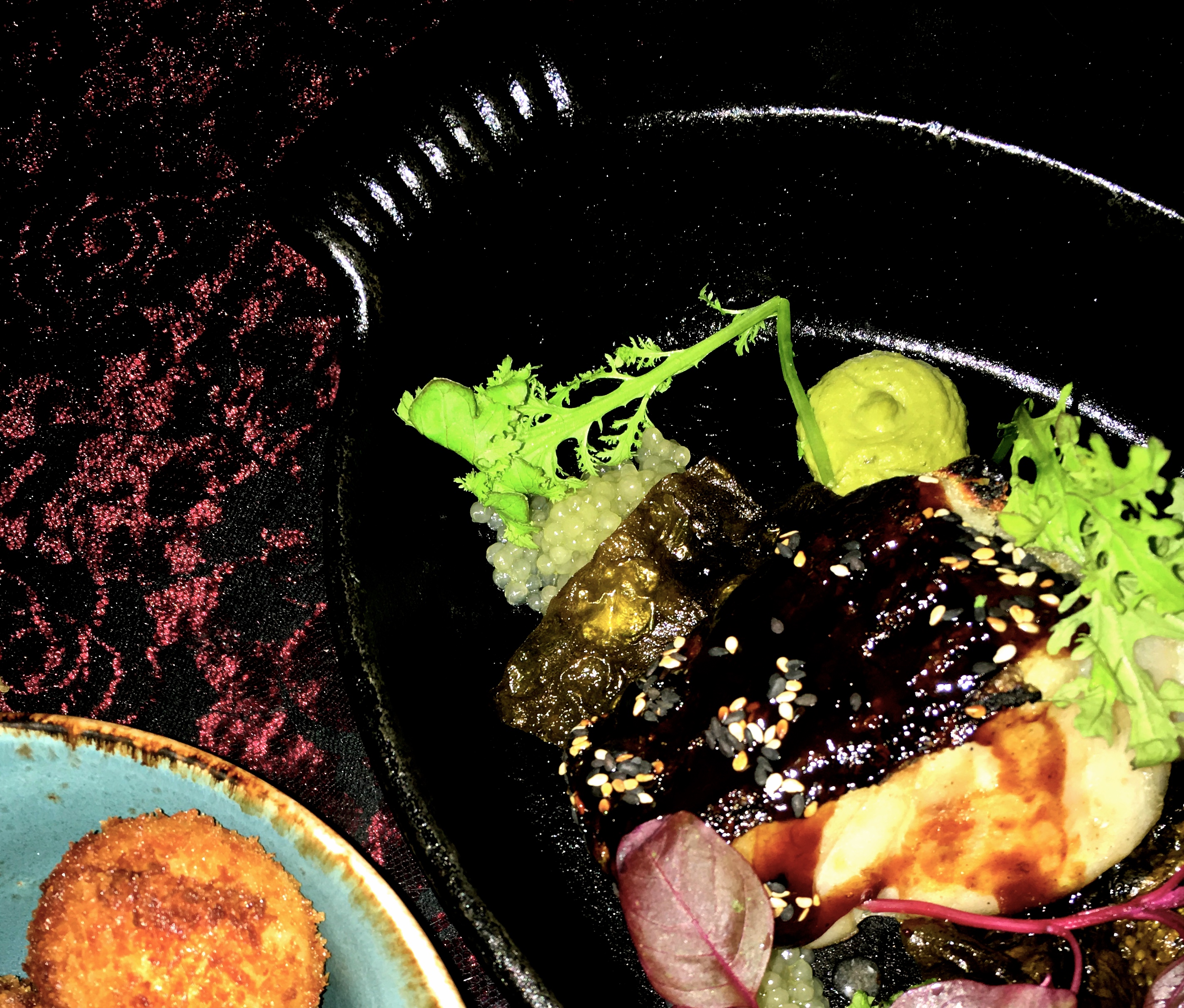 Pääruoaksi valikoin paahdettua turskaa, soijapapupyreetä, tapiokaa ja riisipalloja (36,30€). Annos on näyttävän näköinen ja monipuolinen. Turskaa en ole tainnut syödä sitten viiden vuoden takaisen Portugalin matkamme ja täytyy myöntää, että ensi puraisu on mieleenpainuva, kun tajuan syöväni lipeäkalaa. Tai eihän turskaa enää Suomessa taideta lipeäkalaksi valmistaa, mutta kuitenkin. Pidän kyllä lipeäkalasta – runsaan valkokastikkeen kera – mutta ehkäpä en kuitenkaan tilaisi sitä ravintolassa. Annos on joka tapauksessa maukas; erityismaininnan saavat riisipallot ja tapiokankin hauska helmimäinen koostumus miellyttää minun suutani.