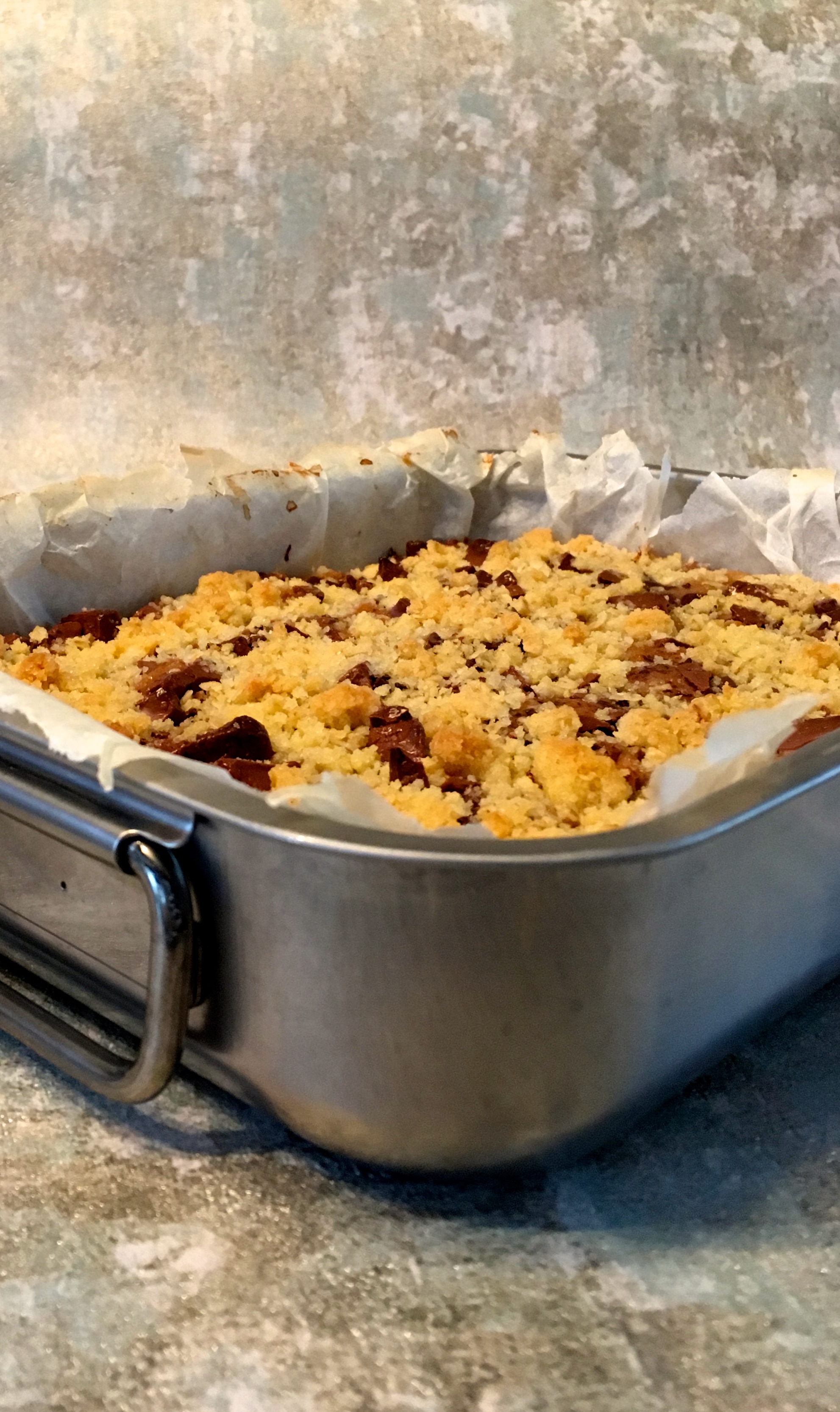 Kaada taikina leivinpaperoituun (neliön malliseen) kakkuvuokaan ja painele jauhotetuin käsin tasaiseksi levyksi. Pistele pohja haarukalla. Alkuperäisessä ohjeessa vuoan kooksi neuvottiin 20×20 cm, mutta itse tein hiukan isompaan (20×26 cm), joka toimi mielestäni paremmin.