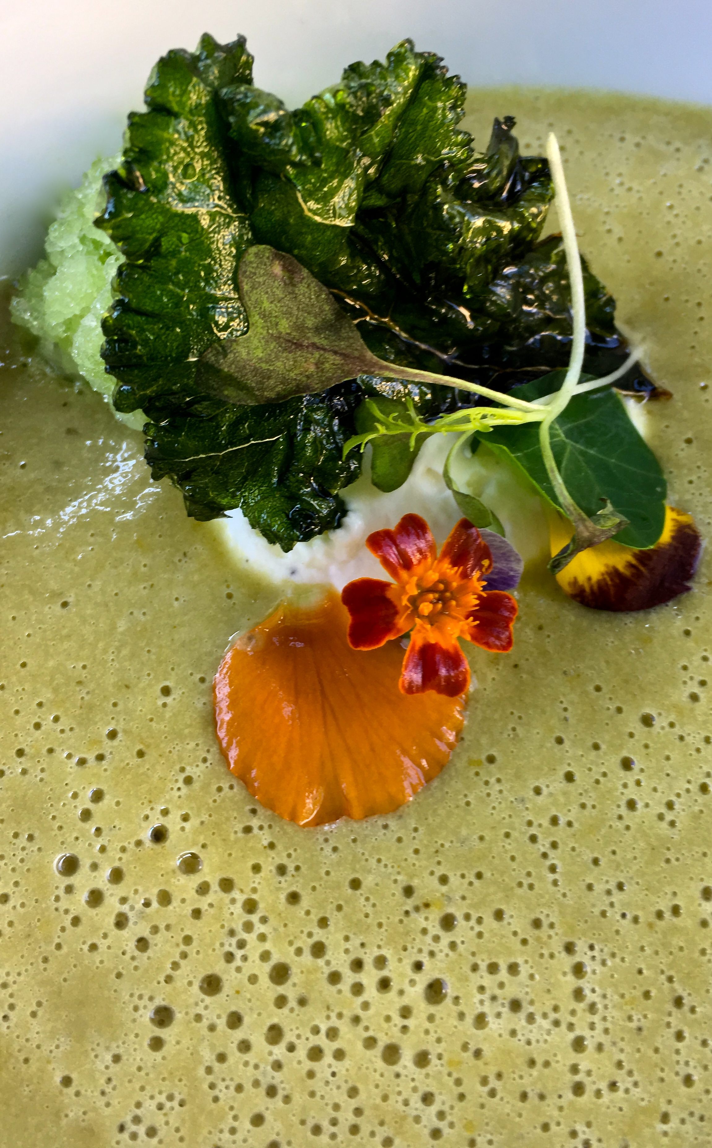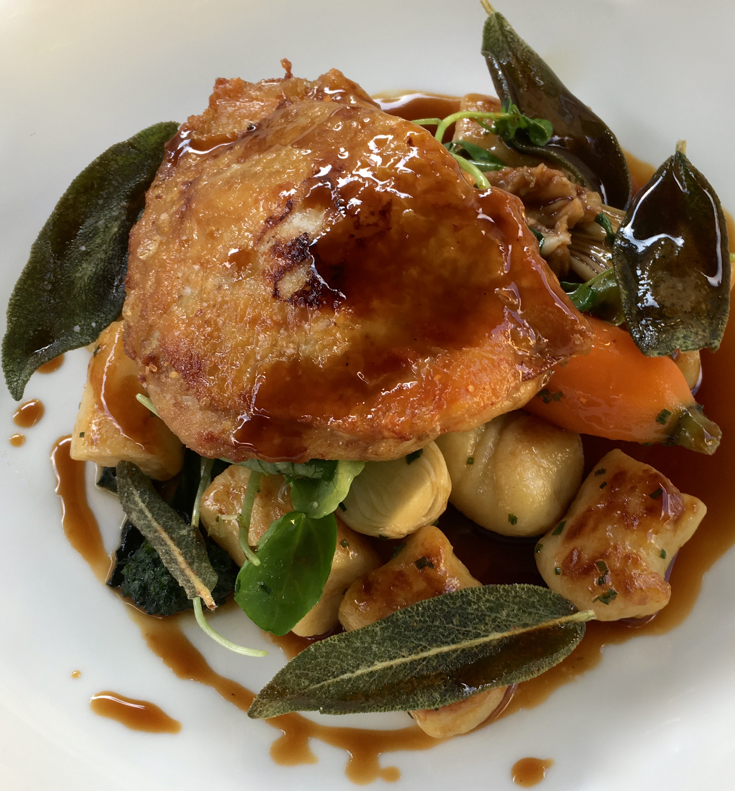 Kesämenun ensimmäinen osa, avomaan kurkkukeitto, on todella hyvää. Kolatun chevre, fritattu lehtikaali ja kurkkugranite elävöittävät ja tekevät annoksesta vieläkin maukkaamman. Tämä aloitus kerää molemmilta täydet pisteet. Kuten sanottua, valikoimme kahdesta pääruokavaihtoehdosta molemmat kukkoa. Viskilän tilan kukonpoika on loihdittu huikean hyväksi annokseksi, jonka täydellistävät salviavoi gnocchit, krassi ja sitruunatimjamikastike sekä fritatut salvianlehdet. Eipä tähän oikein muuta sanottavaa keksi.