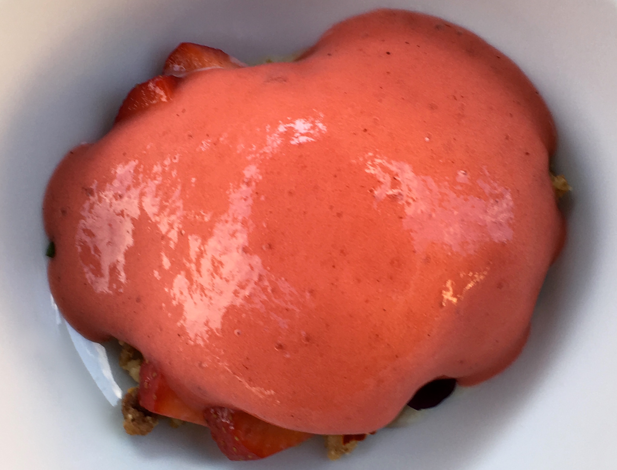 Jälkiruoka, mansikkaa ja ”maitoa”, tarkoittaa mansikoita, maitojäätelöä, crumblea ja mansikkavaahtoa. Taas onnistuminen, mitä nyt omalta kohdaltani pieni miinus tulee mansikkavaahdosta, joka maistui mielestäni hiukan teolliselta. Mutta mutta, poikkeus vahvistaa säännön, Wolkoffin erinomaisuus ei tästä kolahduksesta kärsi.