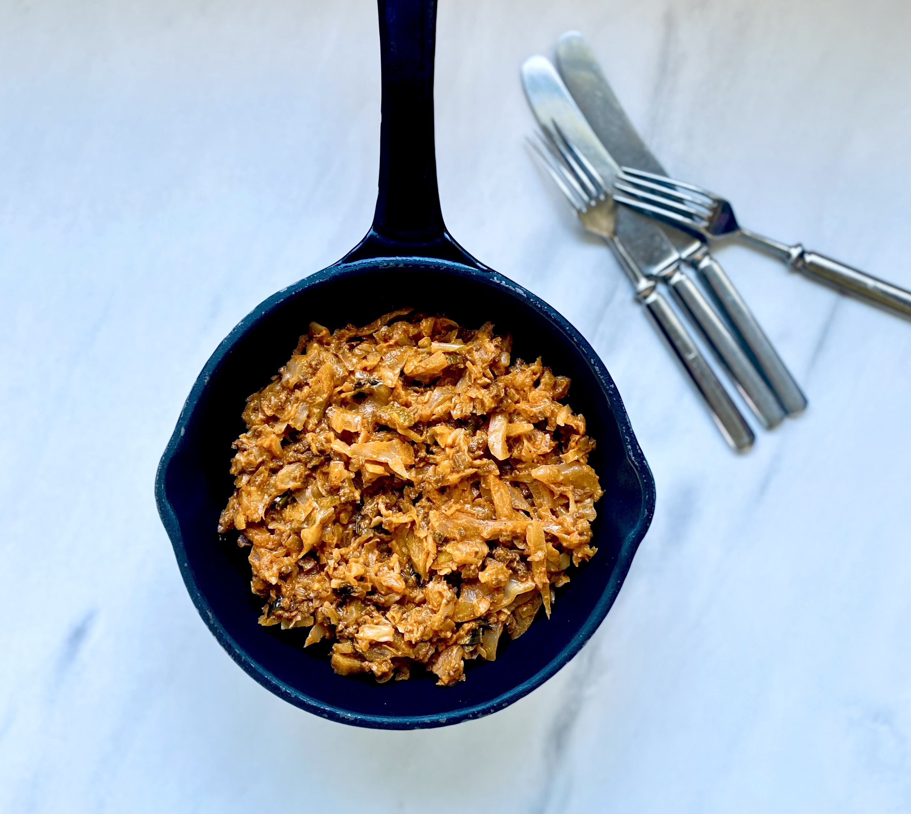Valmista seuraavaksi kaalitäyte. Kuori sipuli. Suikaloi sipuli ja kaali. Kuullota suikaleita pannulla öljyssä sekoitellen noin 5 min. Lisää vesi, balsamico, siirappi, suola, pippuri ja timjami. Hauduta noin 20 min. Lisää tarvittaessa vettä.
