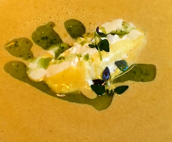Ruokalistalta valitsemme neljän ruokalajin Suomi 100 -menun (à 45,00€) – hmm, mikähän tästäkin tekee niin maamme satavuotista historiaa syleilevän – jonka aloitus, kylmäsavulohitartar vierellään varhaiskaalikimchiä ja tillidressingiä, on todella maukas, ihan nappi, sanoisinko. Eikä seuraavakaan, kukkakaalikeittoa ja vuohenjuustokasvispiirasta, hullumpi ole. Päinvastoin. Hauska idea laittaa pala piirakkaa keiton pohjalle; täytyy ehkäpä napata omaankin kokeiluun.