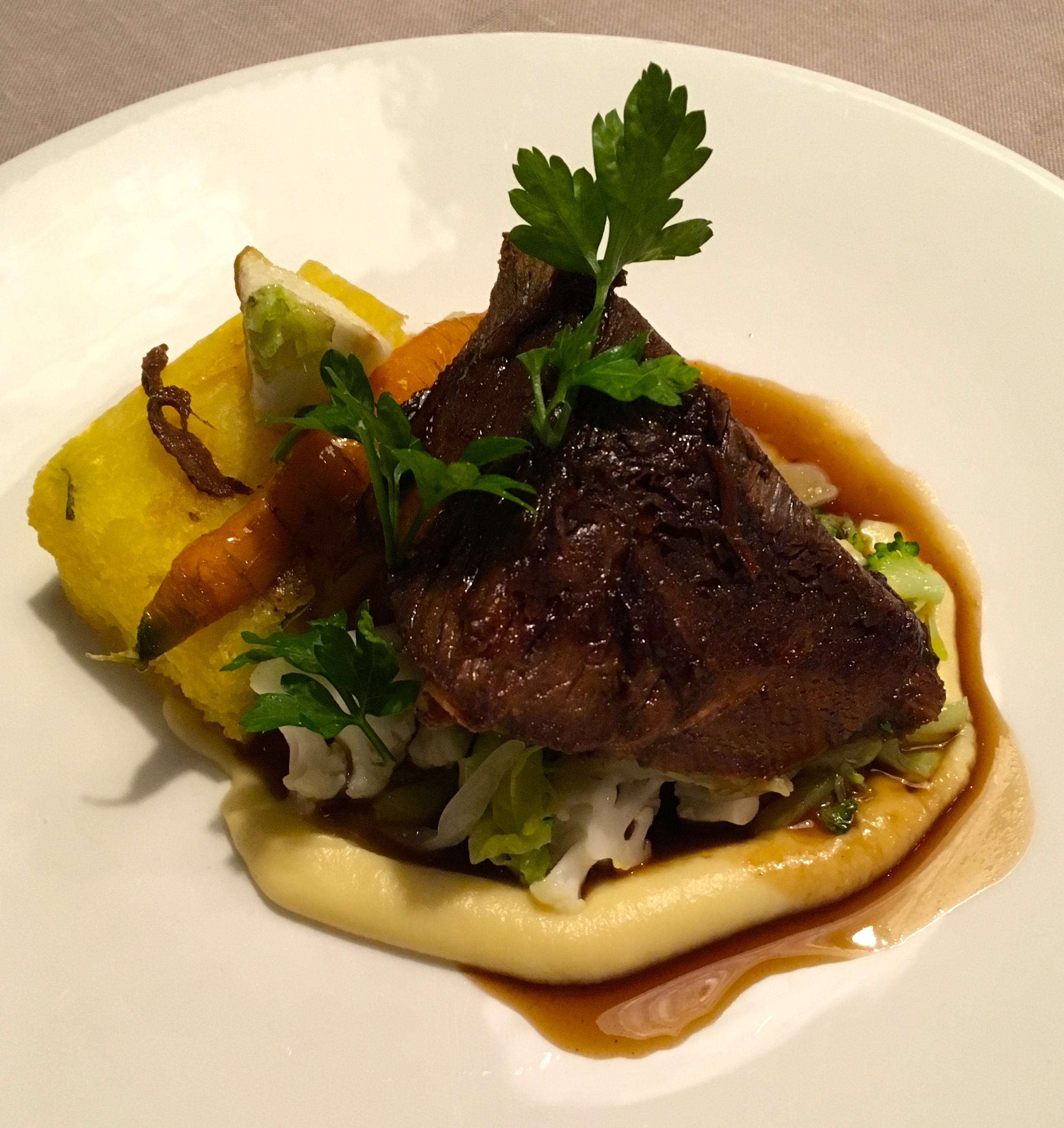 Pääruoan kohdalla eteen tulee pieni pettymys. Annoksen komponentit, ylikypsä härkä, palsternakkapyree, perunakakku ja punaviinikastike, ovat ihan moitteettomia, mitä nyt härkä päässyt himpun verran kuivahtamaan. Ongelma on kuitenkin annoksen mittasuhteissa; lihaa on jopa liian paljon, kastiketta ei oikein nimeksikään, jonka seurauksena koko annos muuttuu kuivaksi ja raskaaksi. Vähemmän lihaa, enemmän kastiketta, tuolloin tyytyväisyys olisi ollut taattu. Tilanne on täysin vastaava kuin Tampereen Pikkubistro Kattilassa, jossa söimme taannoin possunposkia niin ikään annokseen nähden alimitoitetun kastikemäärän kera. Harmi juttu.