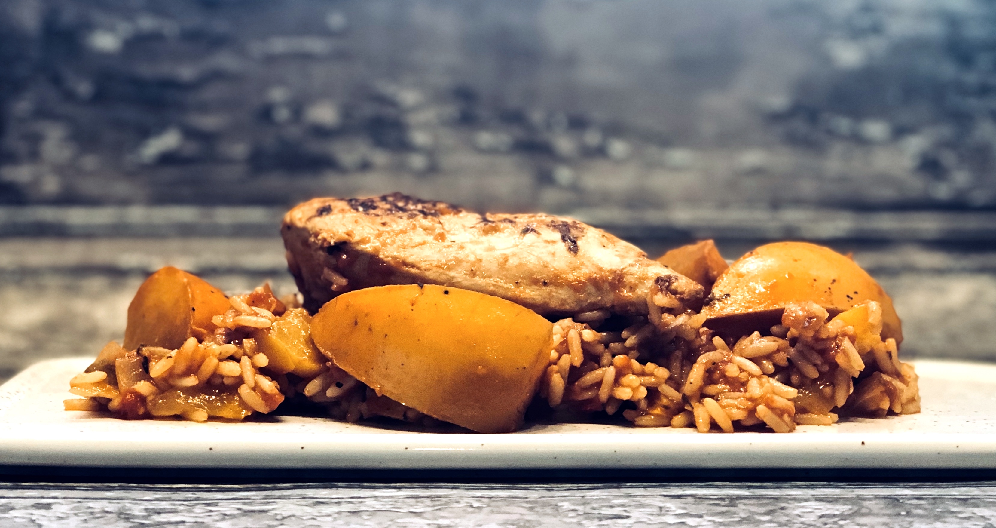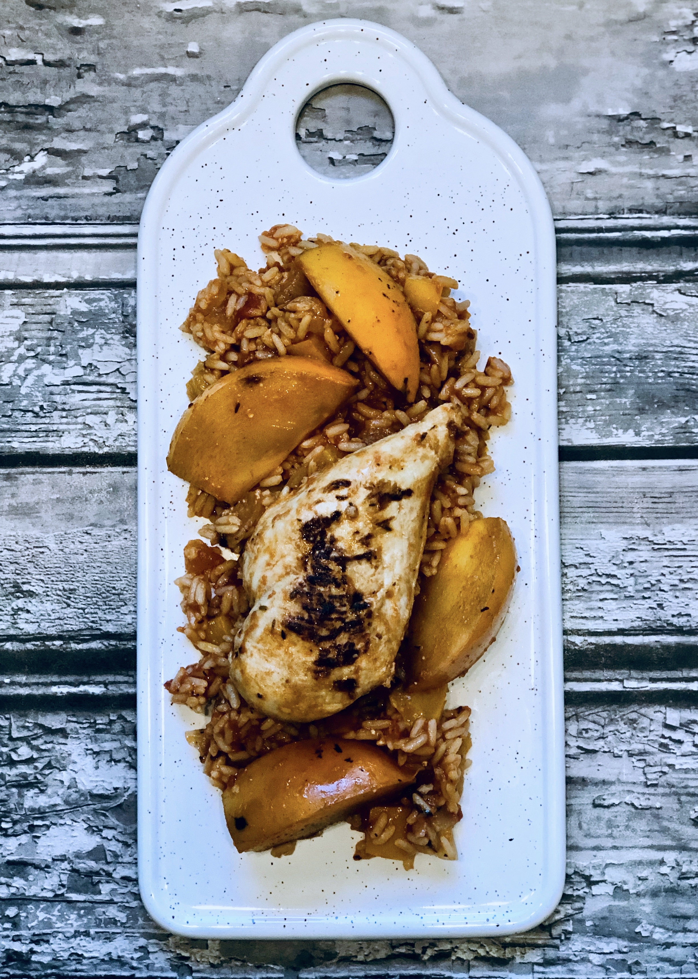 Esivalmisteluiksi riittää ainesosien asettelu uunivuokaan ja pian uunista leijailee jo lumoava tuoksu. Riisit voi periaatteessa kypsentää uunissa samalla kertaa, kunhan vaan muistaa lisätä liemen ja mausteiden määrää. Tai vaihtoehtoisesti keittää riisit erikseen kattilassa. Molempi parempi.