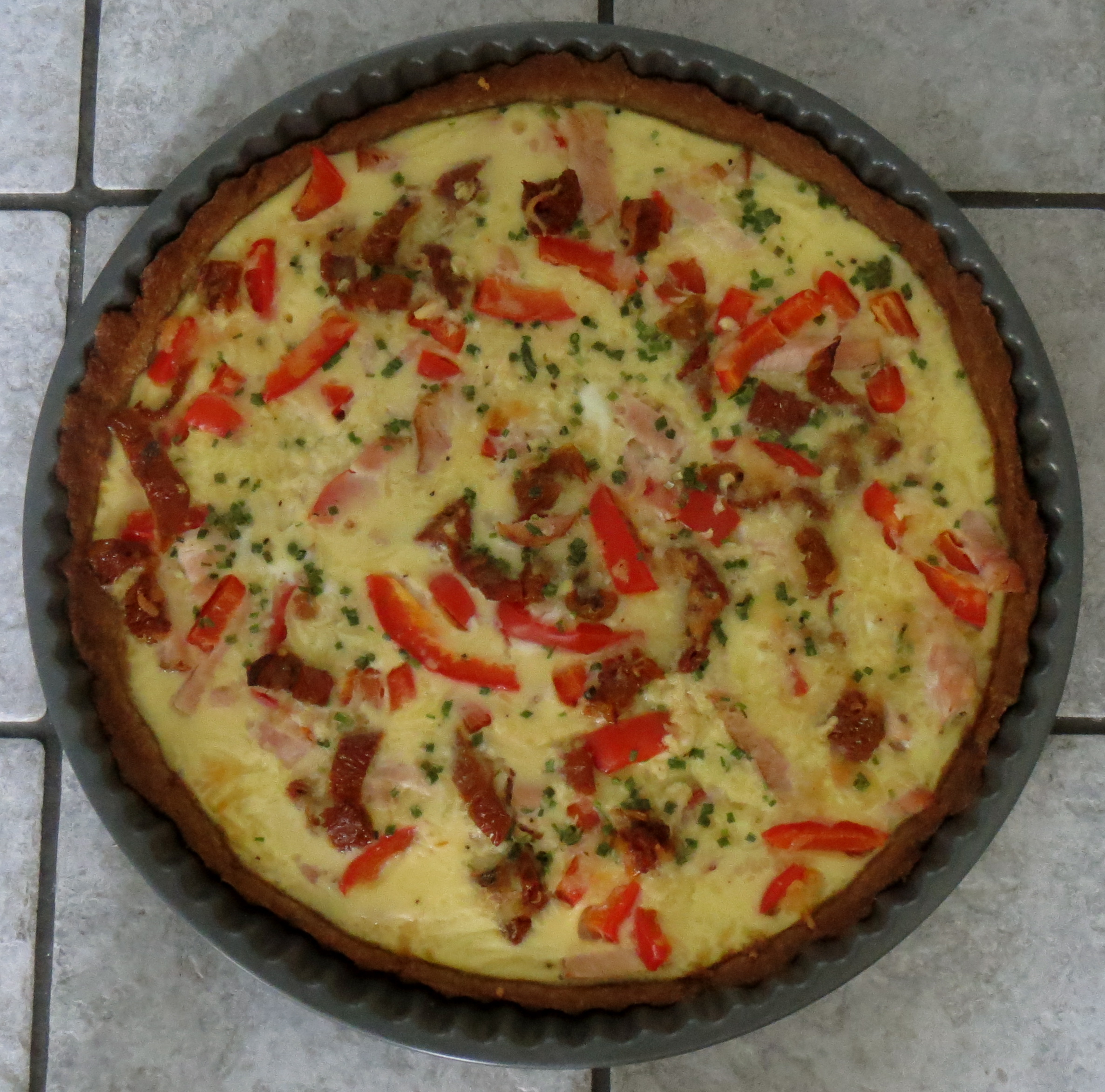 Sekoita keskenään ruokakerma, kananmuna, murskatut valkosipulinkynnet, ruohosipuli, mustapippuri ja suola. Valuta seos vuokaan.