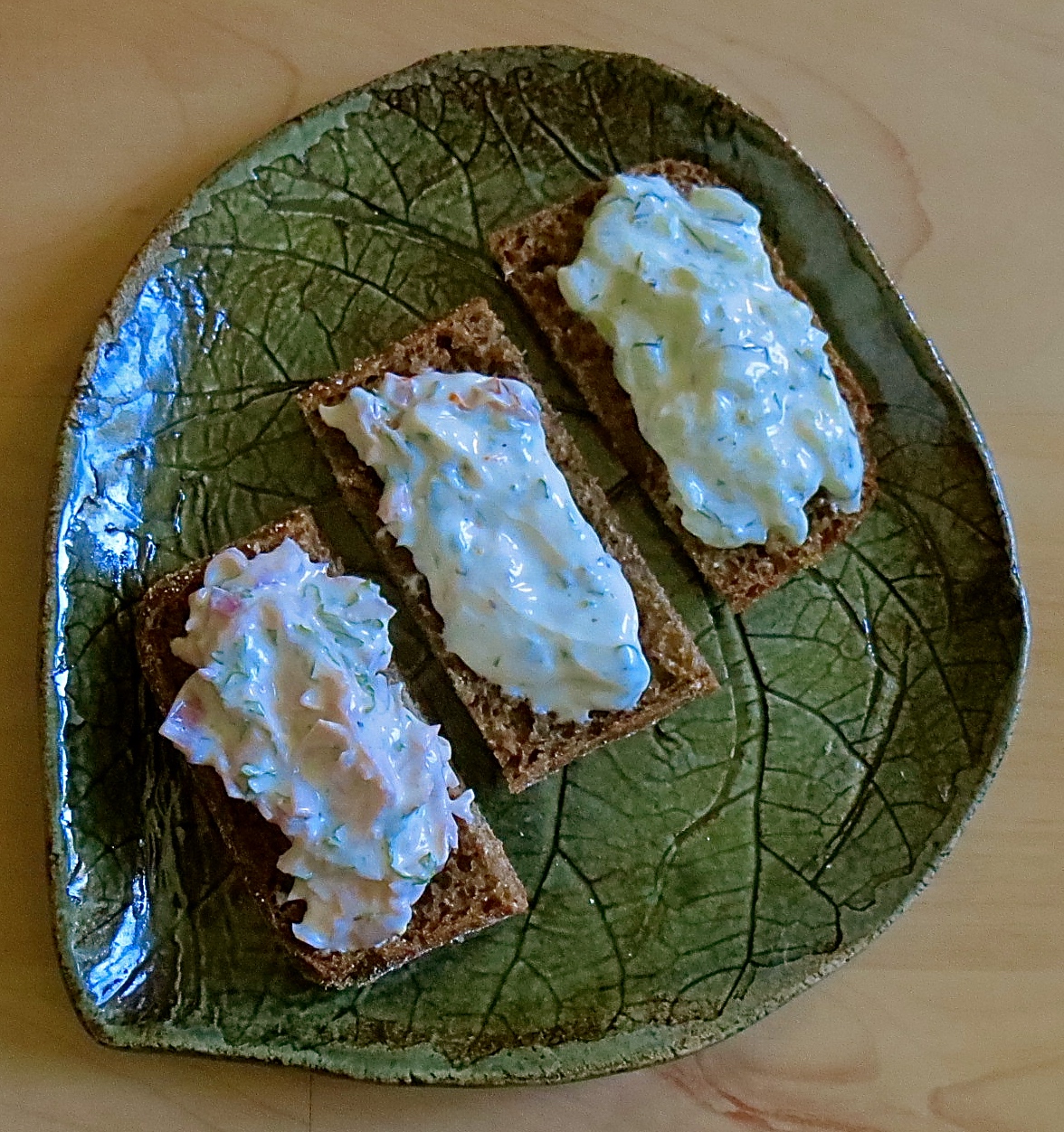 Mitä vappuaaton ateriaan tulee, se sujui kutakuinkin näin: Alkupalalautaselle asteli kolmen konkkaronkka, siis kolme erilaista coctailleipää, tomaatti-rucola, kurkku-jogurtti ja kinkku-punasipuli. Mukavia pikkupaloja. Täytyykin tähän väliin todeta, että mikäli saatavilla on turkkilaista jogurttia ja hiukan mausteita, voi melkein mistä vaan tehtailla herkullisia tahnoja joko leipien tai avokadon kumppaniksi. Vain mielikuvitus on rajana.