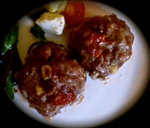 Alkupaloja seurasi perinteinen vappuruoka, perunasalaatti, hiukan erilaiseen asuun puettuna. Hellapoliisilta apinoitu pesto-mozzarella-perunasalaatti toimi ihan hyvin näinkin, mutta vielä parempaa siitä tuli toisella kerralla, kun lämmitimme salaatin. Mozzarella suli mukavasti ja pestokin maistui näin paremmalta. Perunasalaatin ohella söimme jo aiemmin tutuksi tulleita lihapyöryköitäJonna Tervomaan tapaan, joita tuunasin hieman vaihtamalla fetan paprikan makuiseen Koskenlaskijaan. Nam!