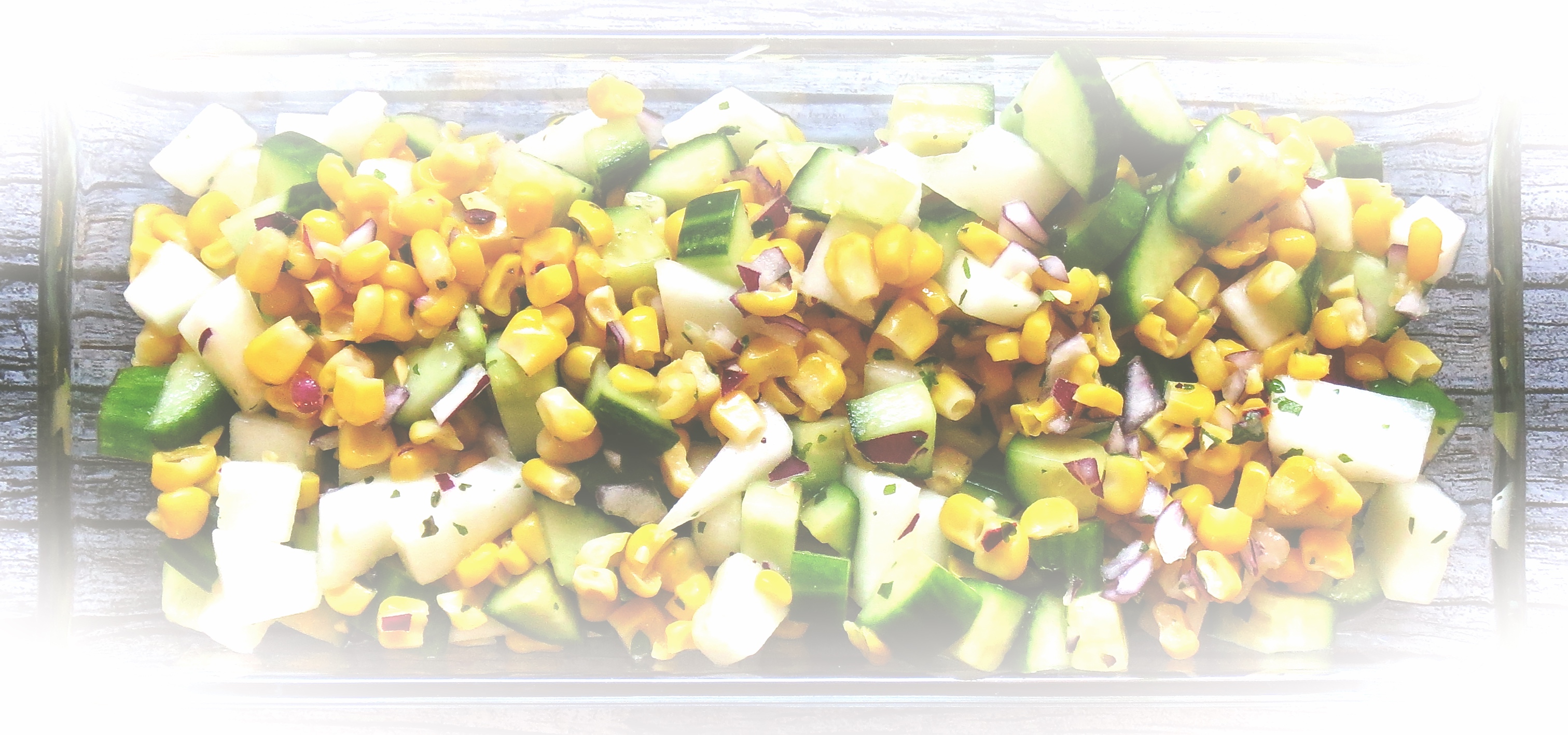 Sulata ja valuta maissit. Kuutioi kurkku ja kuori sekä hienonna punasipuli. Sekoita. Kuori ja pilko sekaan myös hunajamelonia.