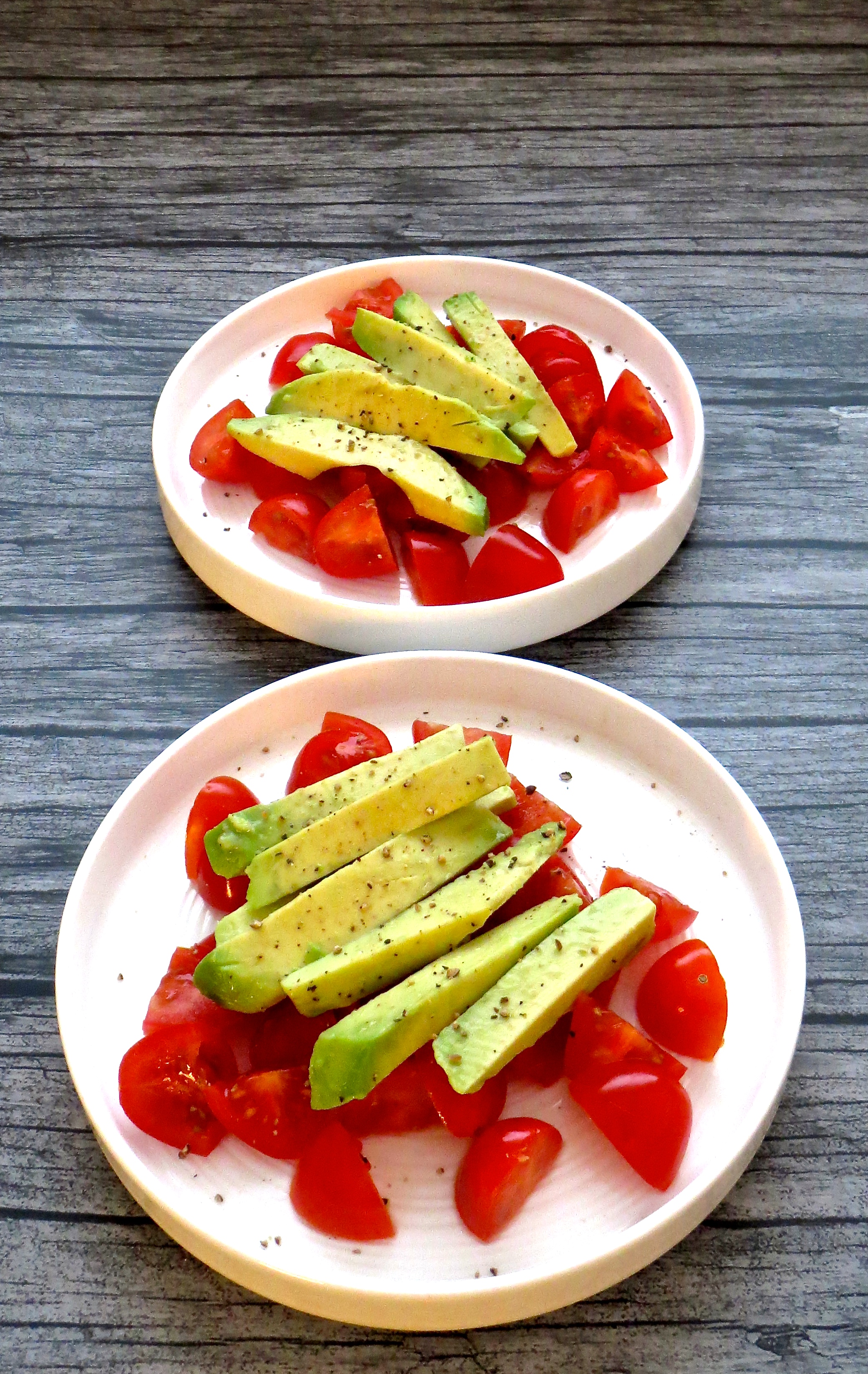 Asettele avokadot tomaattien päälle, rouhi sekaan laadukasta suolaa ja ripottele vielä mustapippuria.