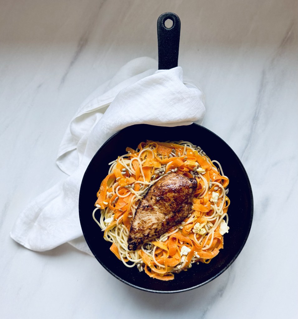 Kun ajattelen pastaa ja juureksia samassa annoksessa, en tunne kovinkaan suurta mielenkiintoa päästä maistelemaan. Pasta kaipaa ympärilleen jotakin raikasta, kuten tomaattia, jotakin kirpeää, kuten sitruunaa tai jotakin täyteläistä, kuten pestoa, mutta juureksia, niitä en ajattele pastan kaipaavan. Siksi ajatus porkkanapastasta tuntui ensi alkuun jopa luotaantyöntävältä. Mutta koska vihanneslaatikko pullisteli porkkanoita ja fetapaketti odotti käyttöönpääsyä, päätin rohkeasti kokeilla. Se kannatti. Lopputulos oli rouhea, makean ja suolaisen tasapainoinen liitto, joka tulee ilman muuta valmistumaan keittiössämme uudelleen. Minä paistoin annokselle kumppaniksi kanaa, mutta hyvin marinoitu tofu olisi varmasti ollut vieläkin parempi valinta. Tätä kannattaa ilman muuta kokeilla.
