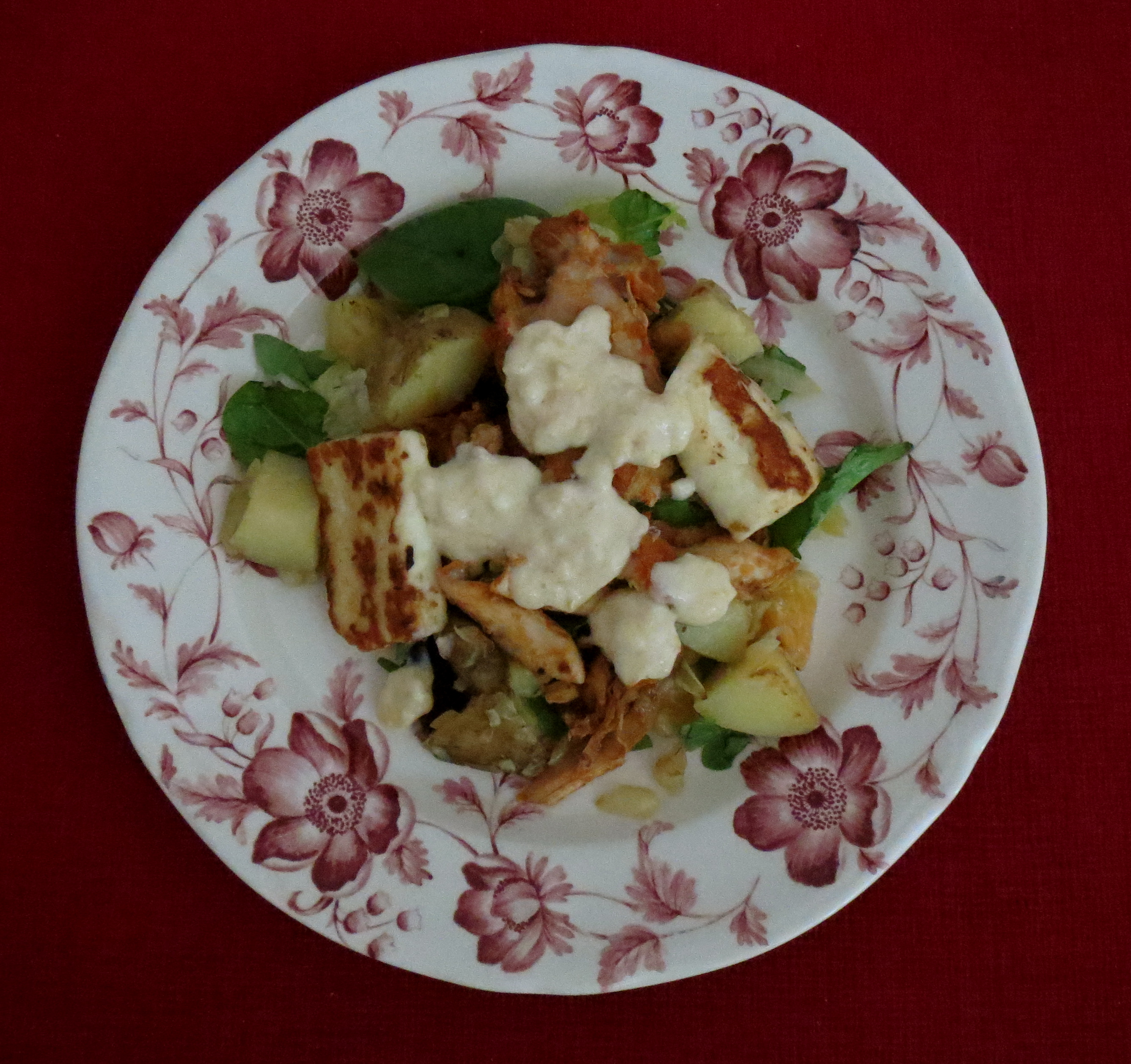 Salaatin yksinkertainen idea on hyödyntää tähteille jääneitä juhannusaterian rippeitä. Tee siis ensin rapea salaattipeti esimerkiksi erilaisista salaateista, tomaatista sekä nektariinista. Tämän jälkeen paista jo keitettyjä uusia perunoita sipulin kera, valmiiksi grillattua broileria (tai muuta lihaa) sekä muutama viipale halloumia ruokailijaa kohden. Kruunaa annos makealla banaani-jogurttikastikkeella.