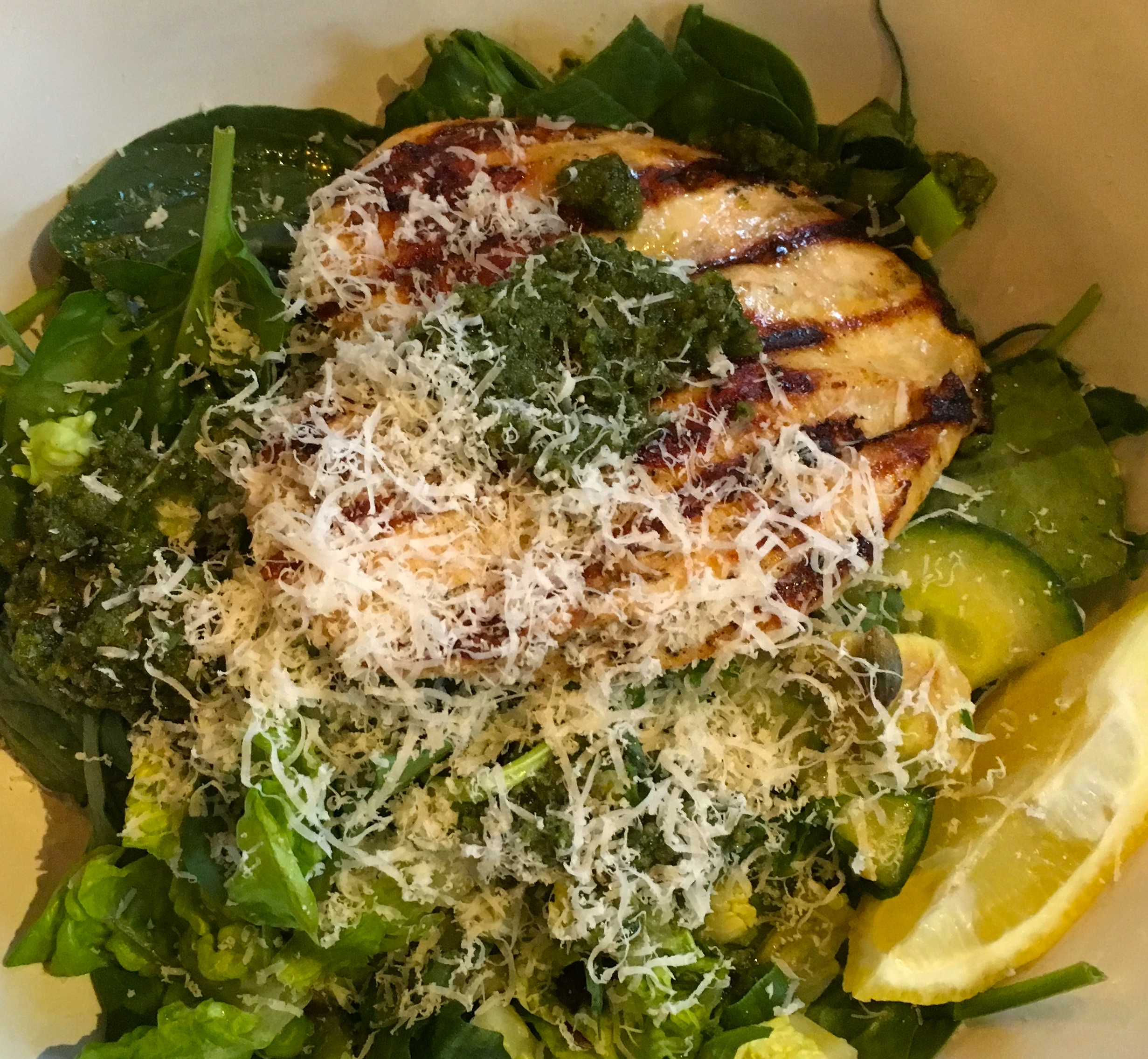 Mutta ruokaan. Itse valitsen vihreän salaatin kanan rinnalla täydellistettynä. Avokadoa, vihreitä papuja, herneitä, kurkkua, erilaisia salaatteja, kevätsipulia, kurpitsan siemeniä ja salsa verdeä, kanan pinnalla mukavasti tuoretta parmesaania. Siis todella hyvää, eikä hinnoittelussakaan mitään moittimista tai Lontoo-lisää, kun annos kustantaa 10,99£. Myös Aleksi arvostaa perinteisen béchamel-kastikkeella ja mozzarellalla kuorrutetun lasagnensa (11,99£) korkealle; todella tuoretta ja kuplivan kuumaa.