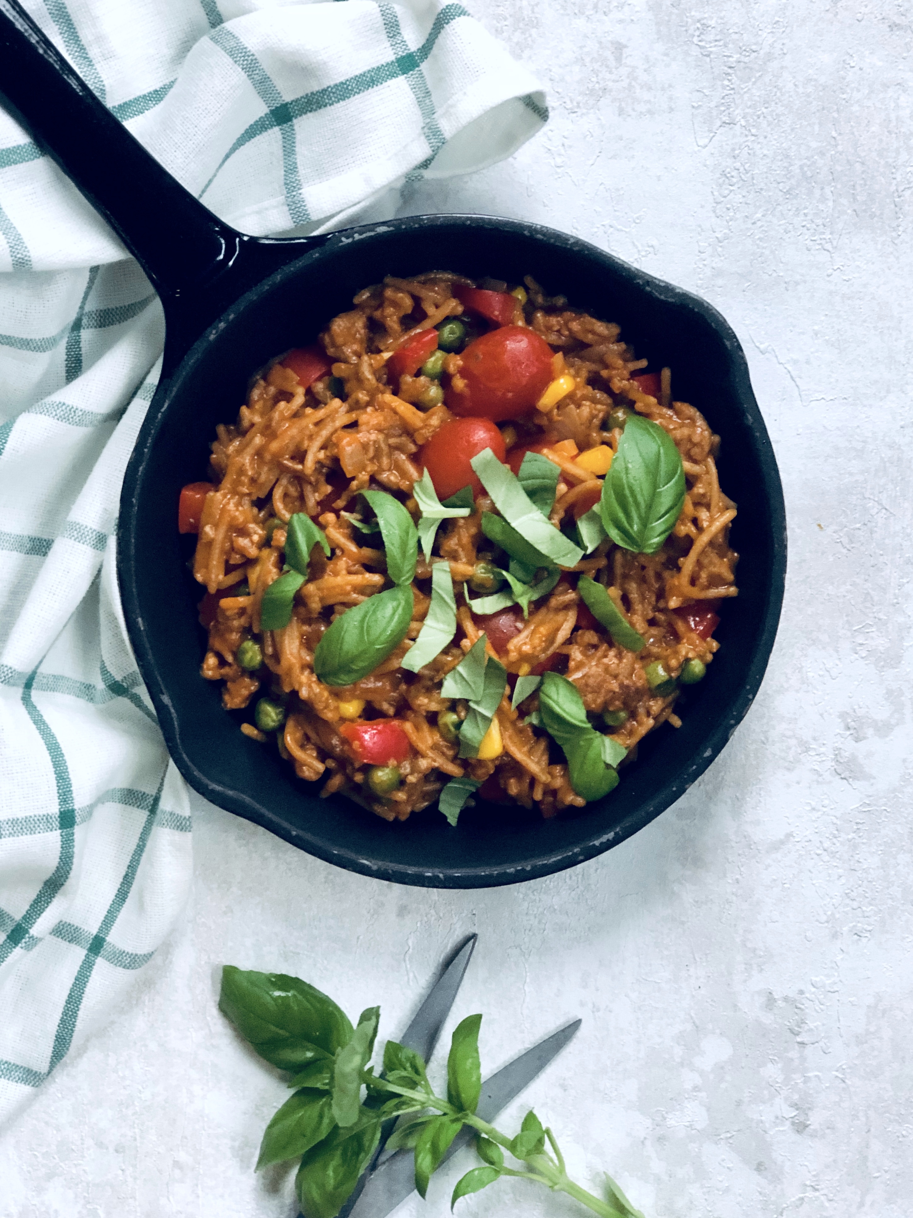 Kuumenna öljy ja tomaattipyree paistokasarissa tai kattilassa. Lisää spagetti ja sipuli. Kuullota keskilämmöllä pari minuuttia. Lisää vesi, liemikuutio, paprikajauhe ja oregano. Kypsennä viisi minuuttia. Lisää maissit, herneet ja paprika. Jatka kypsentämistä, kunnes pasta on kypsää.