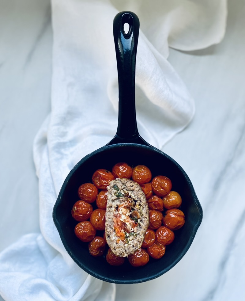 Pilko aurinkokuivatut tomaatit ja kirsikkatomaatit. Levitä ne jauhelihalevyn keskelle ja murustele päälle feta. Käännä reunat täytteen päälle leivinpaperin avulla. Sulje sauma sormin. Aseta täytetty mureke pellille leivinpaperin päälle sauma alaspäin.