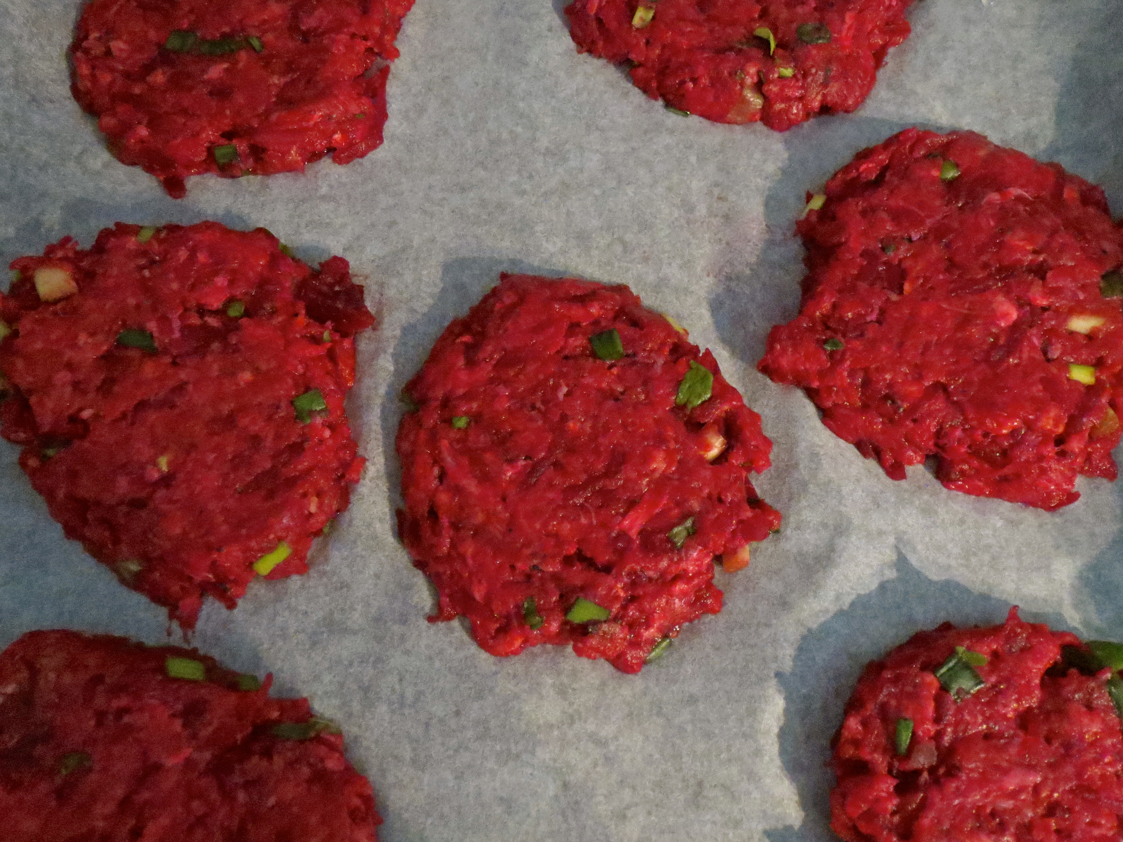 Pane kulhoon jauheliha, punajuuriraaste, kevätsipulit, valkosipuli, suola ja pippuri. Riko sekaan kananmuna.
