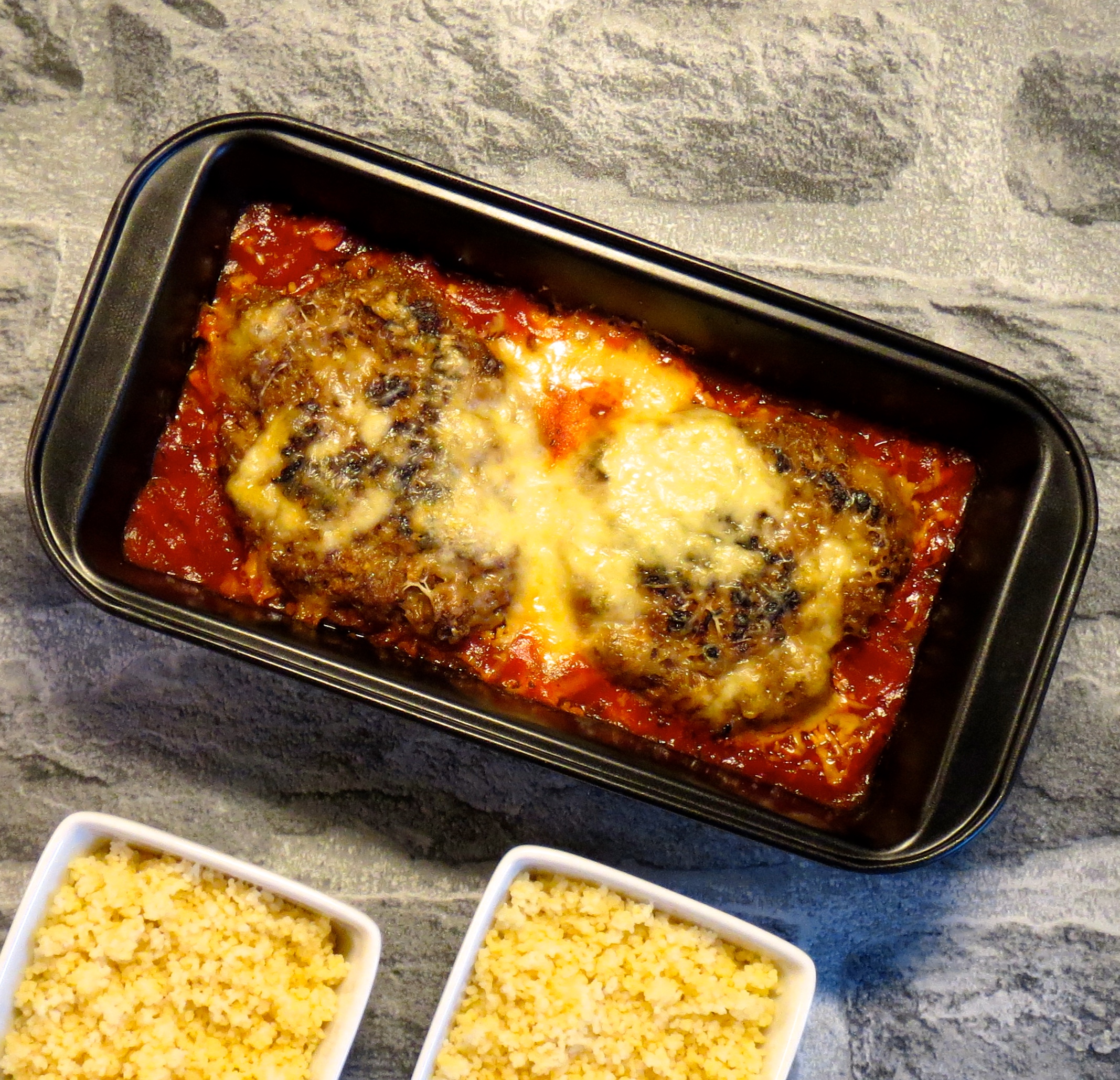 Kaada tomaattikastike uunivuokaan ja asettele pihvit sen päälle. Paina pihvejä hieman tomaattikastikkeeseen ja ripottele pinnalle juustoraastetta. Paista 200 asteisessa uunissa 10-15 min. Keitä valitsemasi lisäke sillä välin valmiiksi.