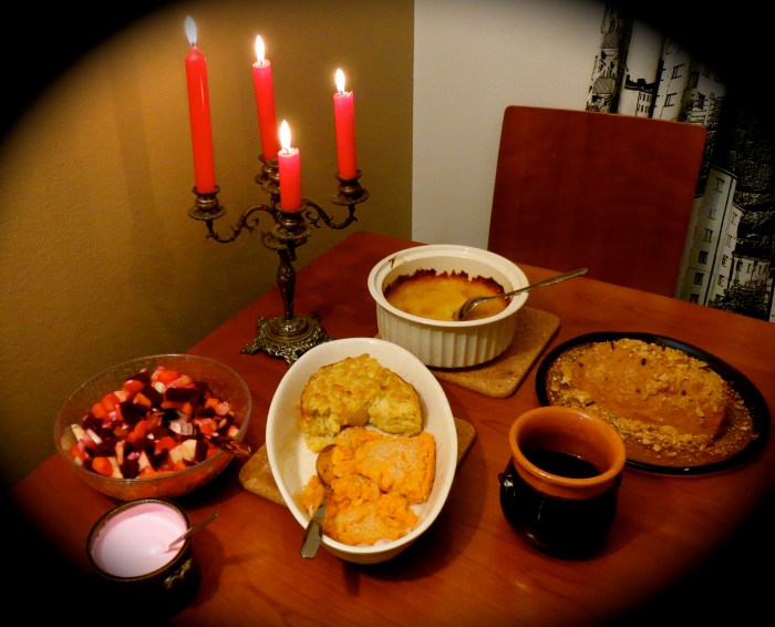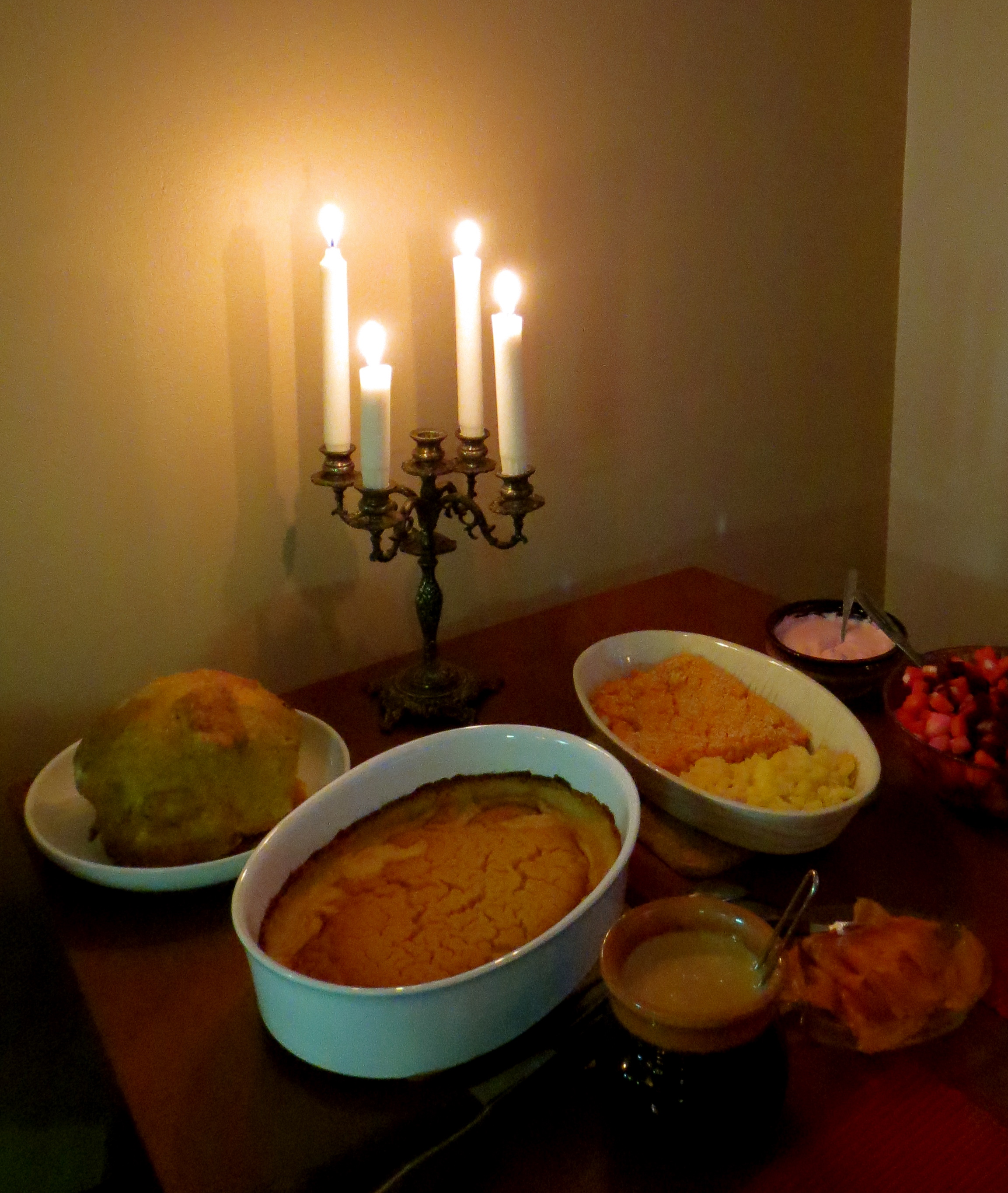 Tänä vuonna oma juhla-ateriamme toteutettiin peruna- ja porkkanalaatikoiden osalta edellisvuosien hyväksi todettuja reseptiikkoja noudattaen ja makaronilaatikko kaavalla, jonka löysimme jo keväällä Verna Kaunisto-Feodorowin Reseptien aarteet -keittokirjaan tutustuessamme. Kaikki hyviä edelleen.
