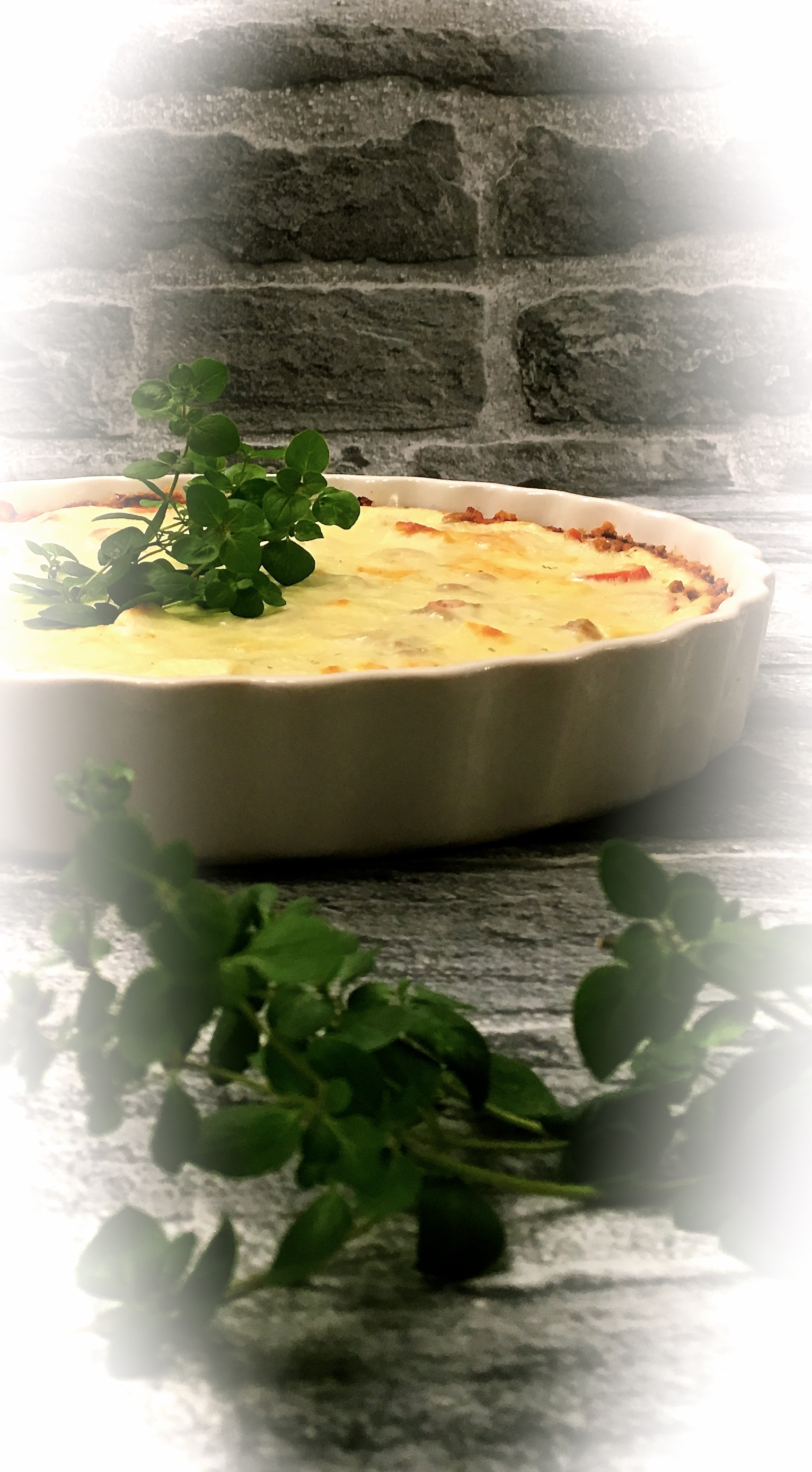 Sekoita keskenään ruokakerma, kananmuna, murskatut valkosipulinkynnet, ruohosipuli, mustapippuri ja suola. Valuta seos vuokaan.
