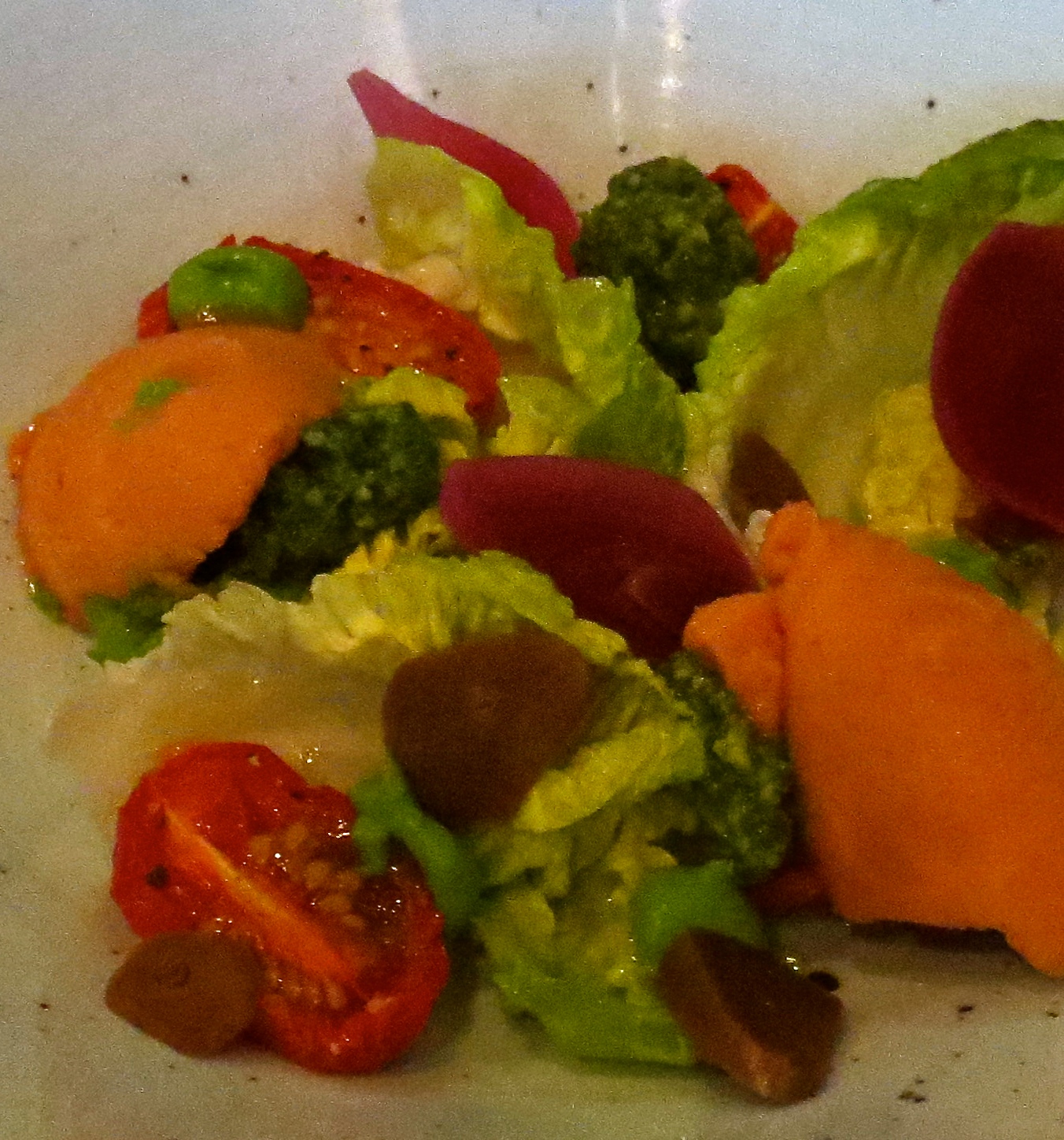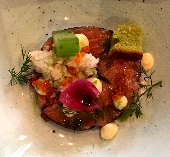 Aloitamme aterian kahden hengen tapas-lajitelmalla. Valinta on kerrassaan mainio; 25 eurolla kaksi henkilöä saa viisi tapasta, jotka ovat reilun kokoisia ja mikä tietysti tärkeintä, myös erittäin maukkaita. Eteemme kannetaan lohiceviche, savustettua vasikkaa parmesankastikkeella, falafelia, vuohenjuustoa punajuuritahnan kera sekä annos bufala-mozzarellaa lisukkeineen. Alkupalalle täydet pisteet.