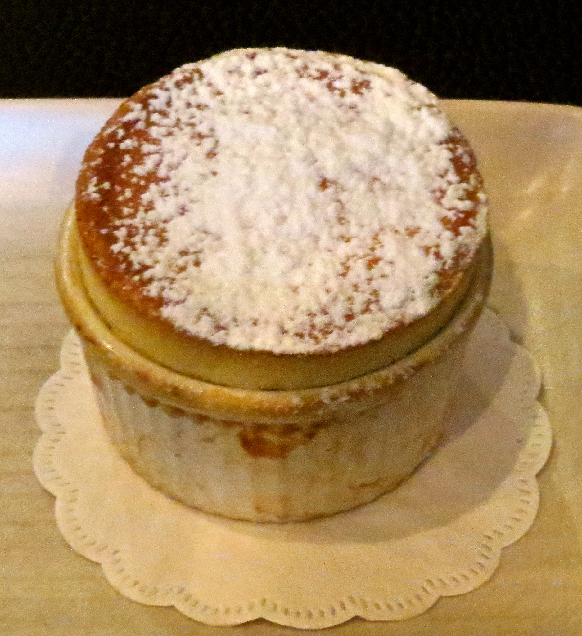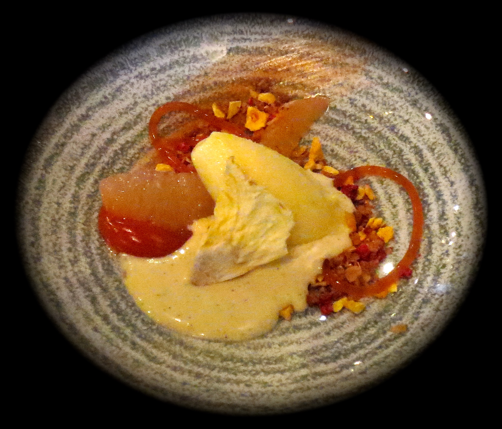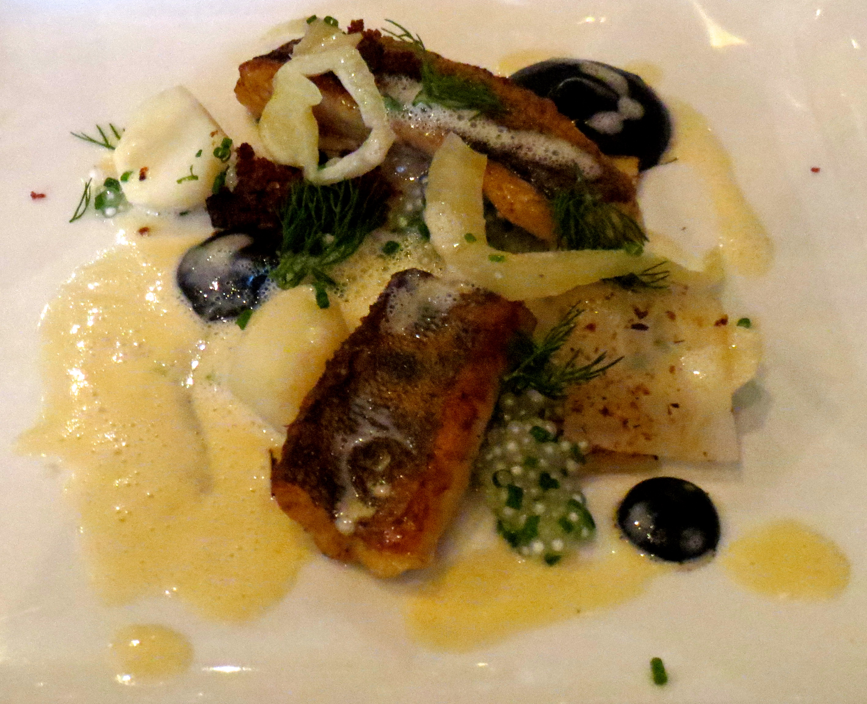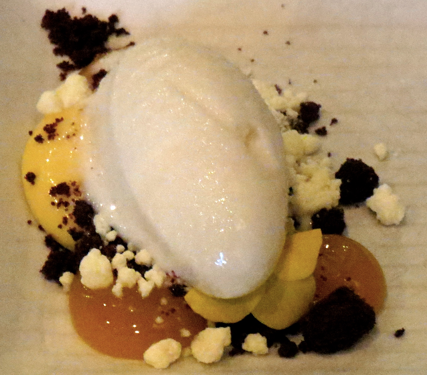 Jos pääruoat saavat moitteita osakseen, jälkiruoat keräävät kiitosta senkin edestä. Itse valikoin jäätelöä ja vadelmaa (6,50€) – suunnitelmissani oli tosin ollut crema catalana, mutta oloni on jo sen verran täyteläinen, että tämä riittänee. Aleksi päätyy financierleivokseen zabaionen ja mustaherukan kera (10,00€) silläkin uhalla, että mantelileivos saattaa olla todellinen no-no. Mutta eipä ole ei. Pienen pienten leivoskaksosten vanavedessä pöytäämme saapuu niin ikään hurmaava uunituoreuden tuoksu. Annoksen muut komponentit, joita suhteessa leivosten kokoon on ruhtinaallisen paljon, ovat ihastuttavia nekin. Todella ensiluokkainen jälkiruoka-annos, sellainen ”leivos”, jonka itsekin popsisin ilomielin. Myös oma jäätelöni on tavallista parempaa, pohjalla mukavaa suklaarouhetta ja päällä kinuskikastiketta – ihan pyytämättä muuten.