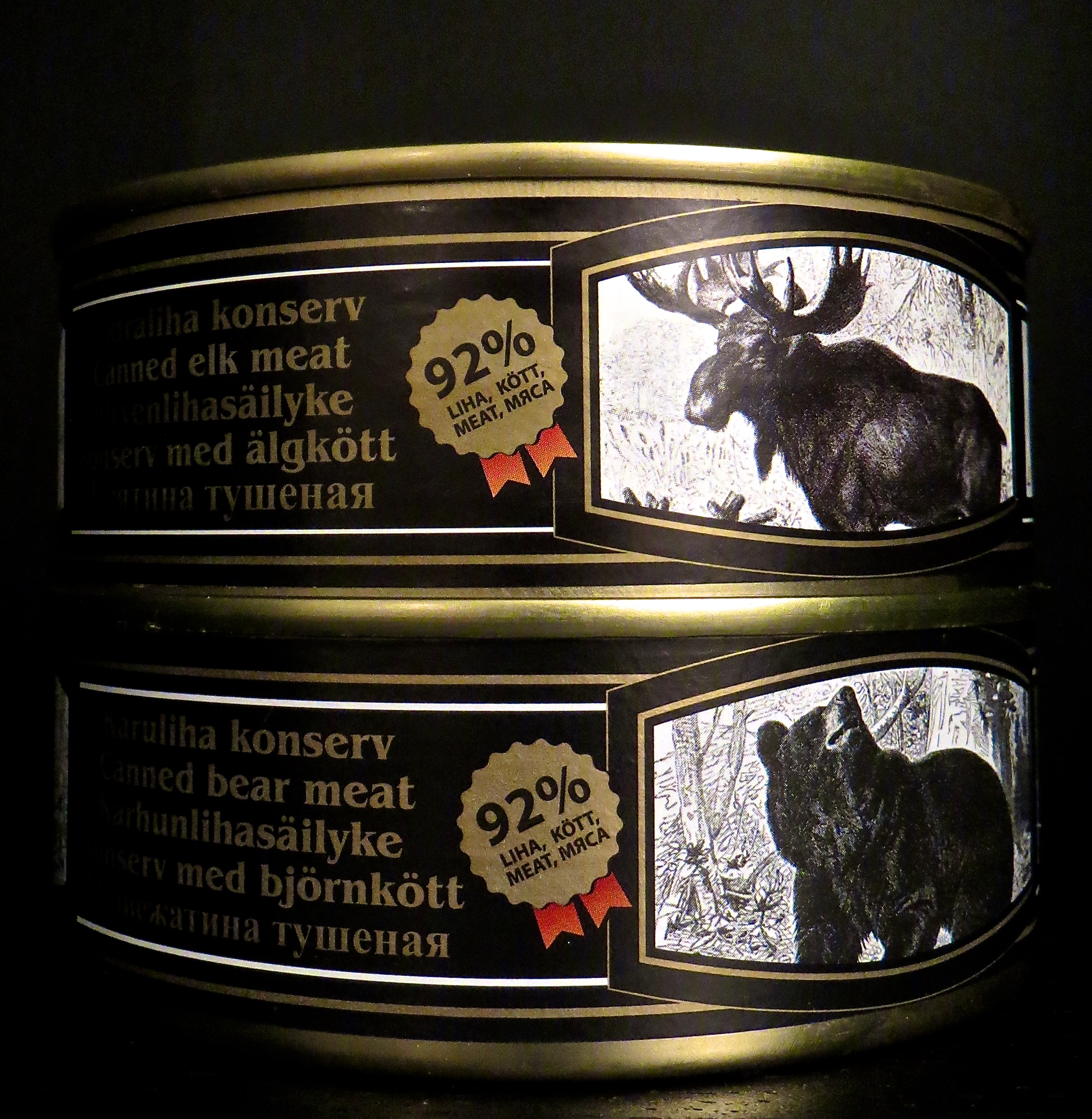 Appivanhempien mukana meille kulkeutui tölkillinen karhua – siis lihaa, ei olutta. Mikään uusi tuttavuus karhu ei meille ollut; viimeisen vuoden aikana olemme maistelleet sitä kaksi kertaa ravintolassa ja kerran kotona, kotiversiota tuolloinkin tölkistä käsin. Ravintola-annoksista Bellevue veti ehdottomasti pidemmän korren karhupaisteineen, Saslikin karhufrikadellien jäädessä hiukan valjuksi kokemukseksi. Mitä tölkitettyihin kontioihin tulee, ensimmäisellä kerralla onnistuimme paremmin. Karhuburgerpihvit olivat tuolloin ihan maukkaita, niiden jäädessä tällä kertaa sille tasolle, että itse päädyin täyttämään burgerini perinteisellä jauhelihapihvillä. Tiedä sitten, mikä oli erona, mutta nyt liha maistui kummalliselta, rasvaiselta ja tölkkimäiseltä. Taisi olla eri merkkiä kuin viime kerralla. Tuolloin kyseessä oli karhusäilyke virolaisen Linnamäen tapaan, nyt en sattunut painamaan merkkiä mieleeni.