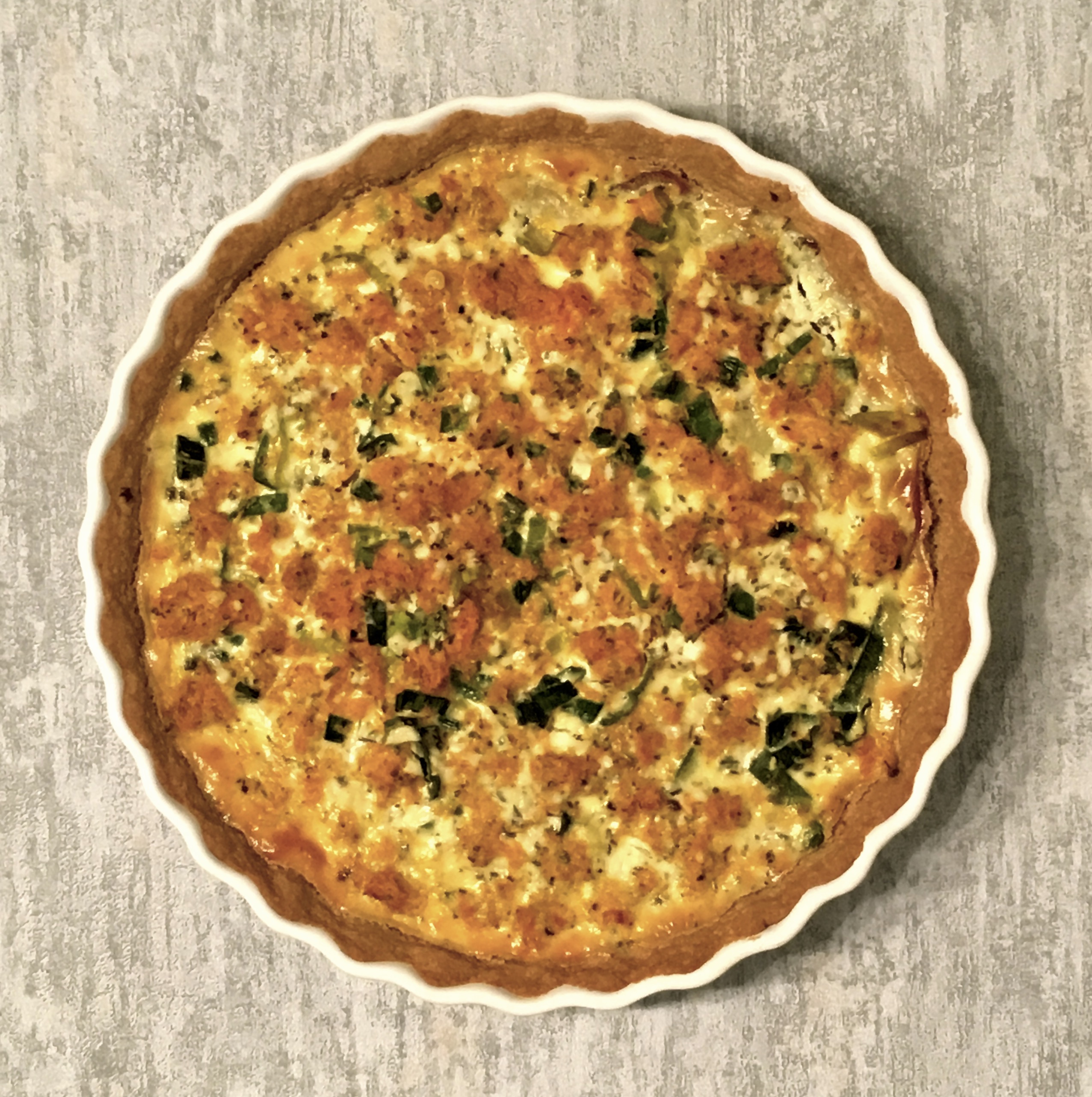 Paista 200-asteisessa uunissa noin 30 min. Tarkkaile piirakan pintaa. Jos se tummuu liikaa, peitä piirakka loppuvaiheessa foliolla.