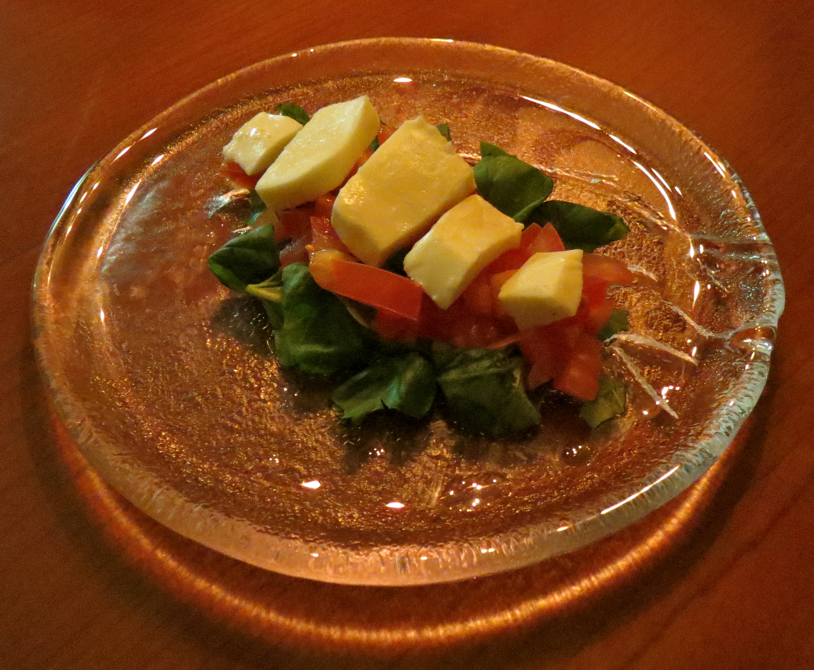 IMG_0826Revi basilika paloiksi ja asettele se lautaselle. Pilko tomaatti ja asettele se basilikan päälle. Paloittele mozzarella ja laita palat salaattipedin päälle. Viimeistele annos pirskottelemalla limemehua annoksen päälle.