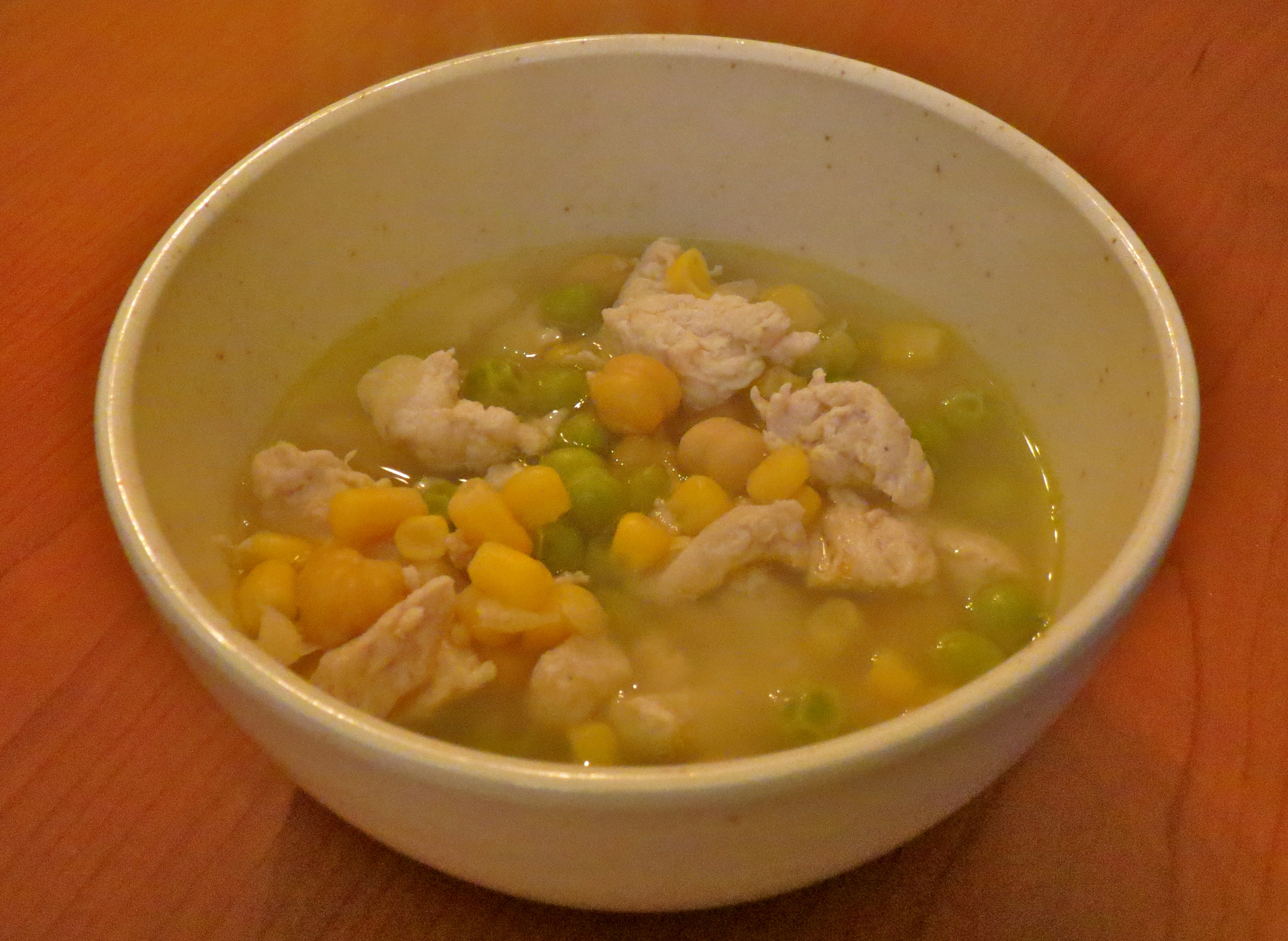 Ruskista broilerinsuikaleet öljyssä. Siirrä ne kattilaan. Lisää vesi, liemikuutiot, pippuri ja laakerinlehdet. Valuta liemet säilykkeistä. Lisää maissi ja huuhdellut kikherneet. Keitä kannen alla 15-20 min.