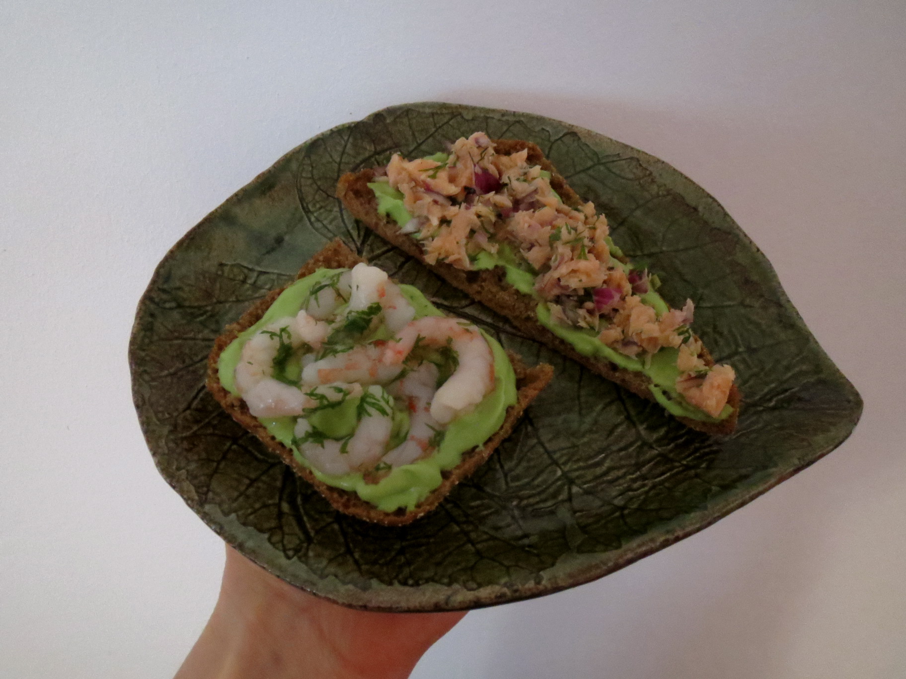Leikkaa leipä haluamallasi tavalla neljään osaan. Sivele jokaisen palan pohjalle avokadotahnaa. Nosta sen jälkeen kahdelle palalle tahnan päälle marinoituja katkarapuja, kahdelle lohitartaria. Anna vielä leipien tekeytyä hetki jääkaapissa.