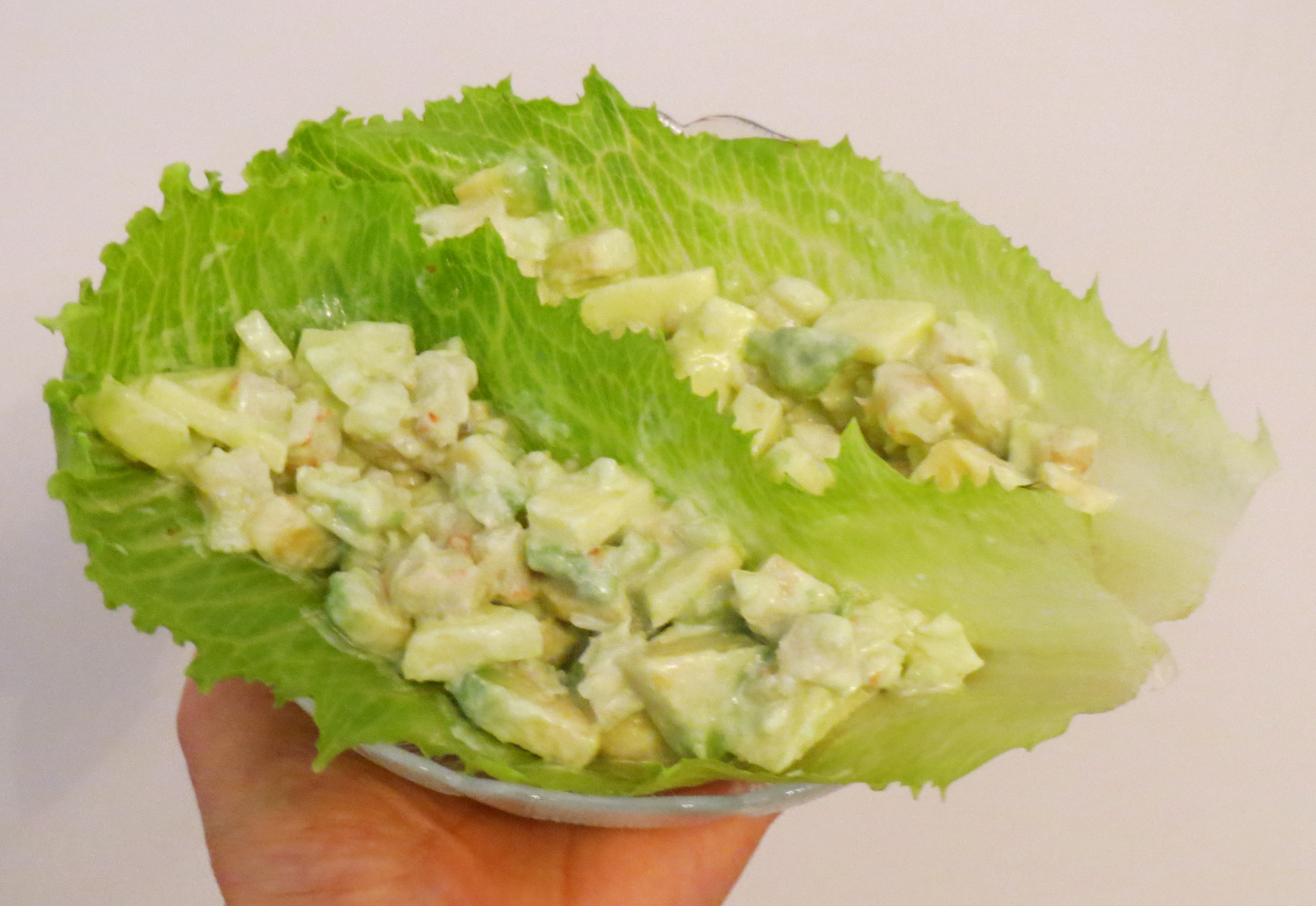 Halkaise avokadot ja poista kivet. Leikkaa hedelmäliha kuutioiksi, samoin kurkku. Sekoita rapujen joukkoon kevyesti nostellen.