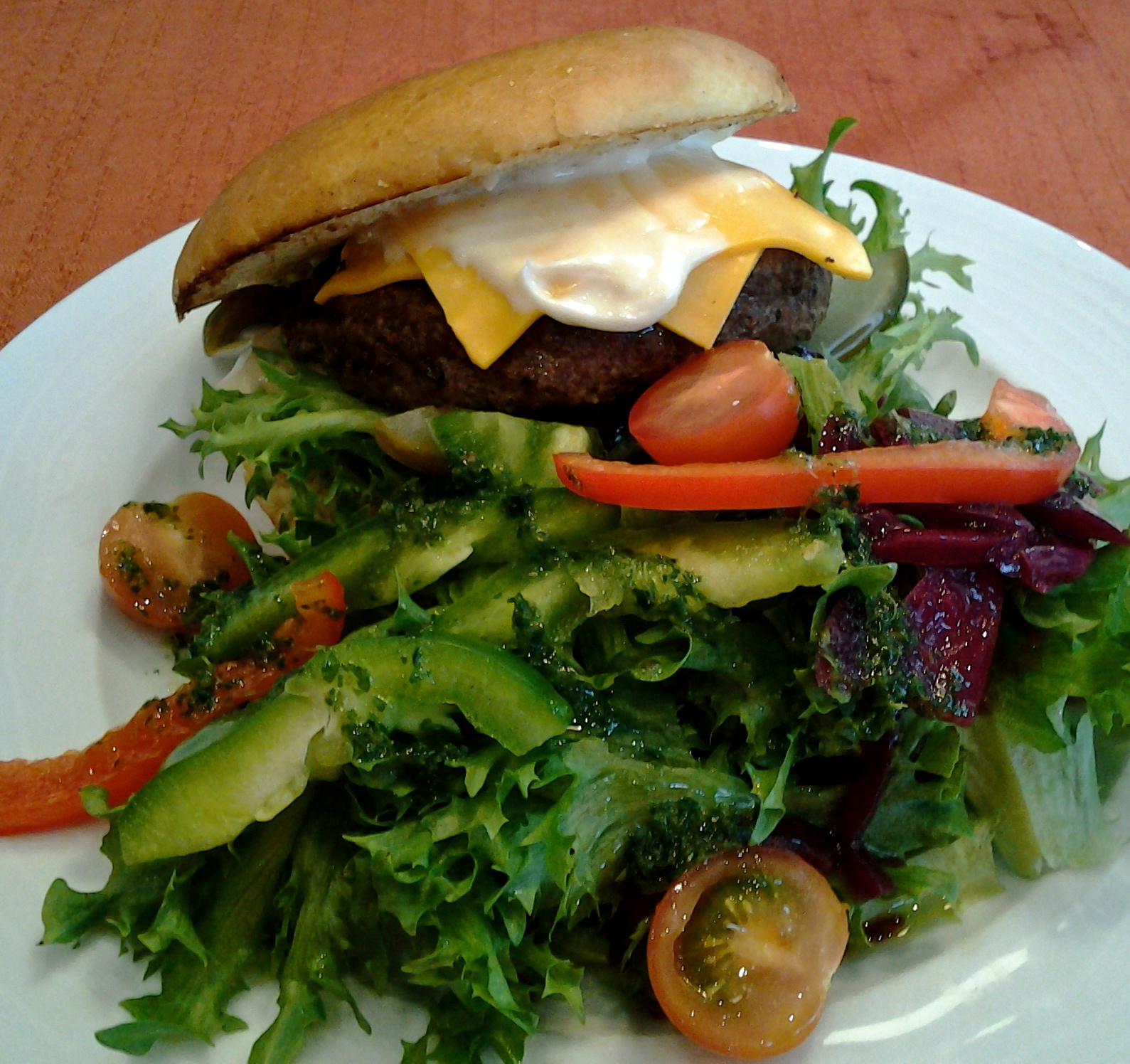 Koska tarkoituksena on nauttia ainoastaan suhteellisen yksinkertainen päivällinen, jätämme alkupalalistan tällä kertaa huomiotta ja hyppäämme suoraan pääruokien pariin. Minä valikoin listalta kana-pinaattisalaatin, jossa grillattu kanafilee saa seurakseen salaattipedille herkkusieniä, avokadoa, paprikaa, kurkkua, pinaattia, sekä hunajakastiketta (16,50€). Sieniä olisi saanut olla enemmän ja luvatut leipäkuutiot puuttuvat kokonaan, mutta muuten annos on kelpo, mielestäni täysin hintansa väärti ja sellainen mukava salaattiannos, jonka jälkeen tuntuukin siltä, että on syönyt salaattia. Niin ikään Aleksin kana-pestorisotto chilillä ja paprikalla maustettuna (16,50€) on hyvää ja jättää jälkeensä sopivan pikku poltteen.